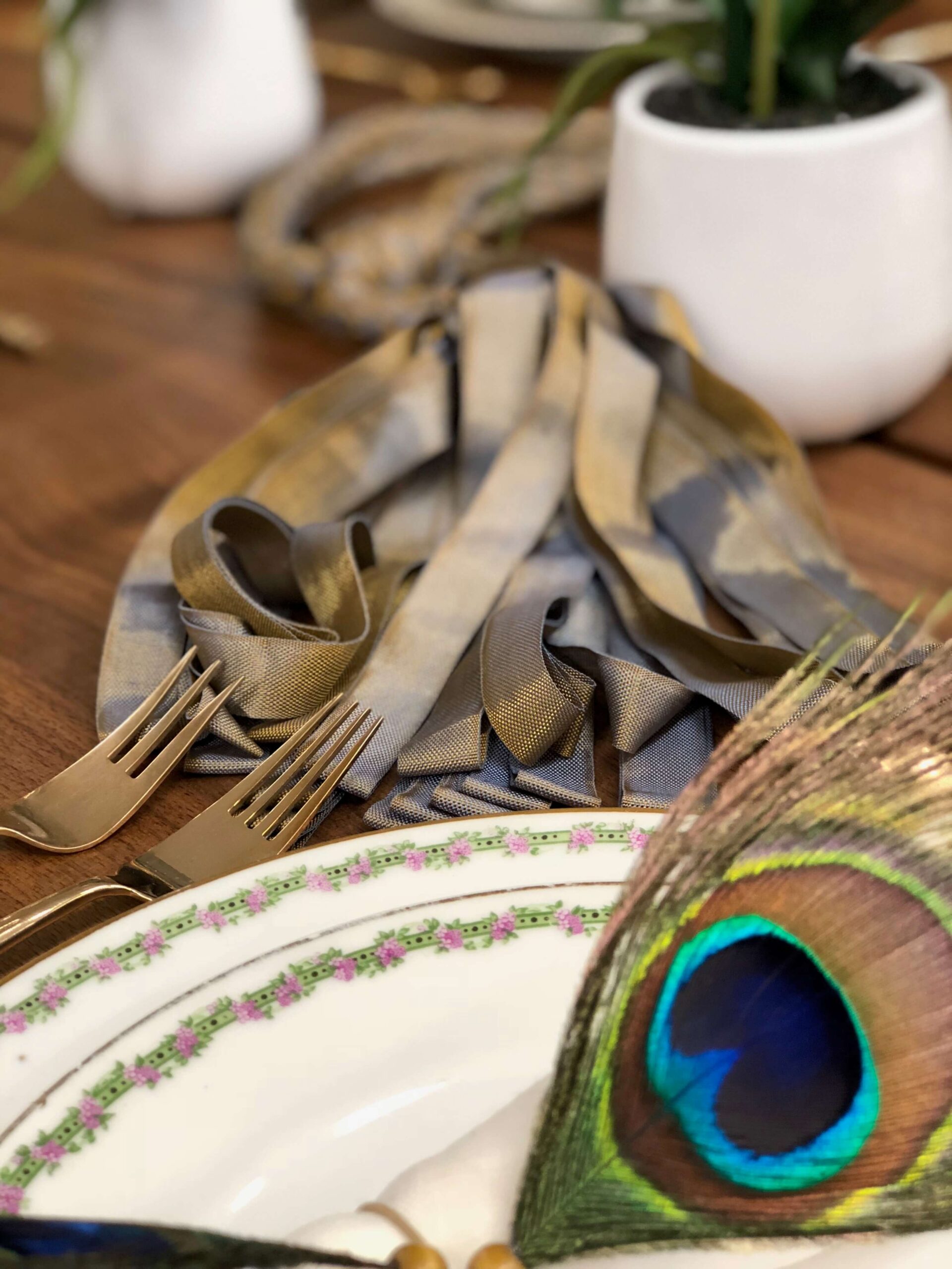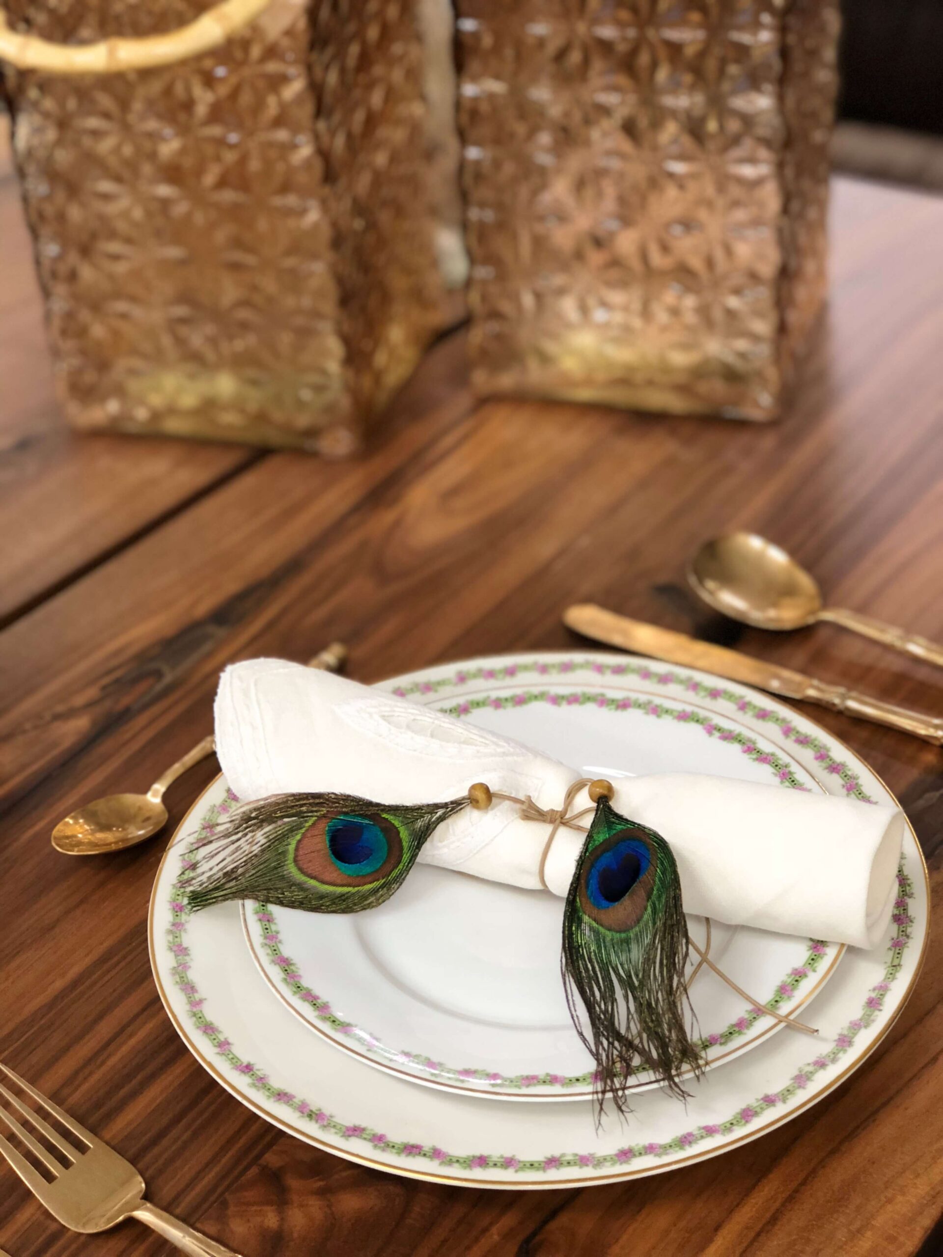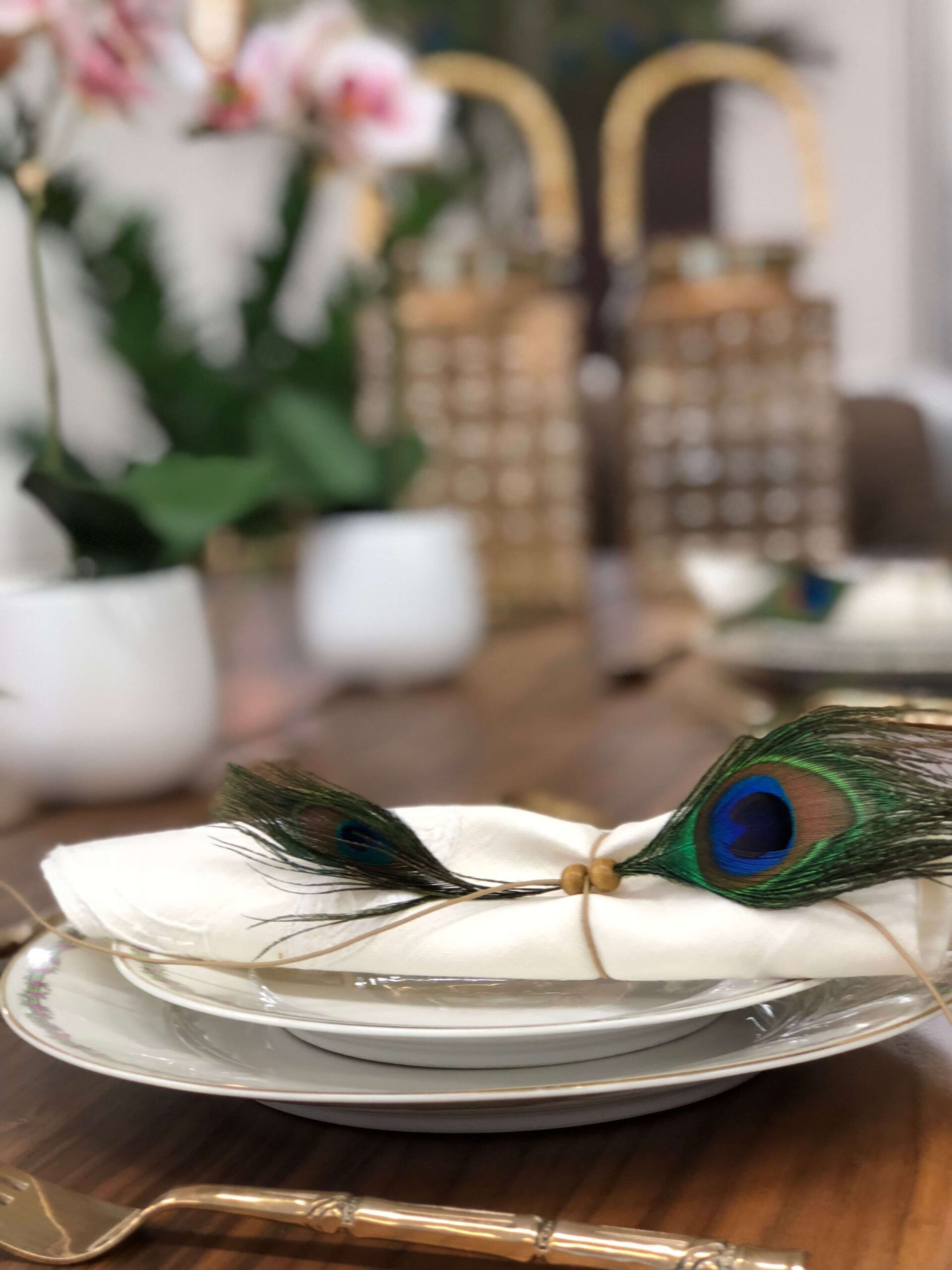 Εμείς ξεκινήσαμε από τα φτερά παγονιού τα οποία στόλισαν το βάζο που βάλαμε στο τραπέζι μας αλλά και τις πετσέτες φαγητού των καλεσμένων μας. Τα υπέροχα πρασινογάλαζα χρώματα στα φτερά “έδεσαν” υπέροχα με το vintage σερβίτσιο φαγητού με την χρυσή μπορντούρα και τα μοβ ανθάκια αλλά και με τα μαχαιροπήρουνα σε χρυσό χρώμα και σχήμα μπαμπού.