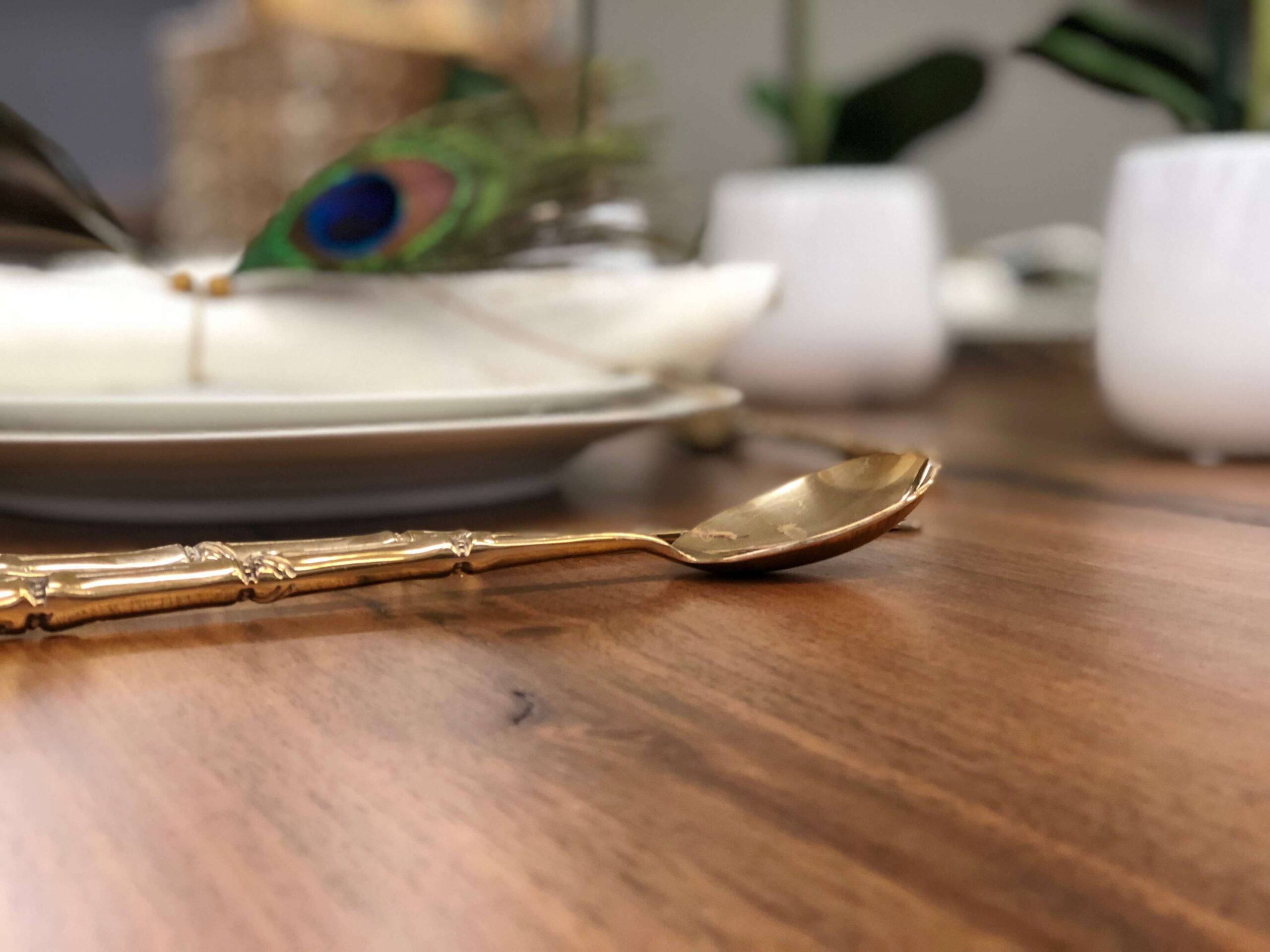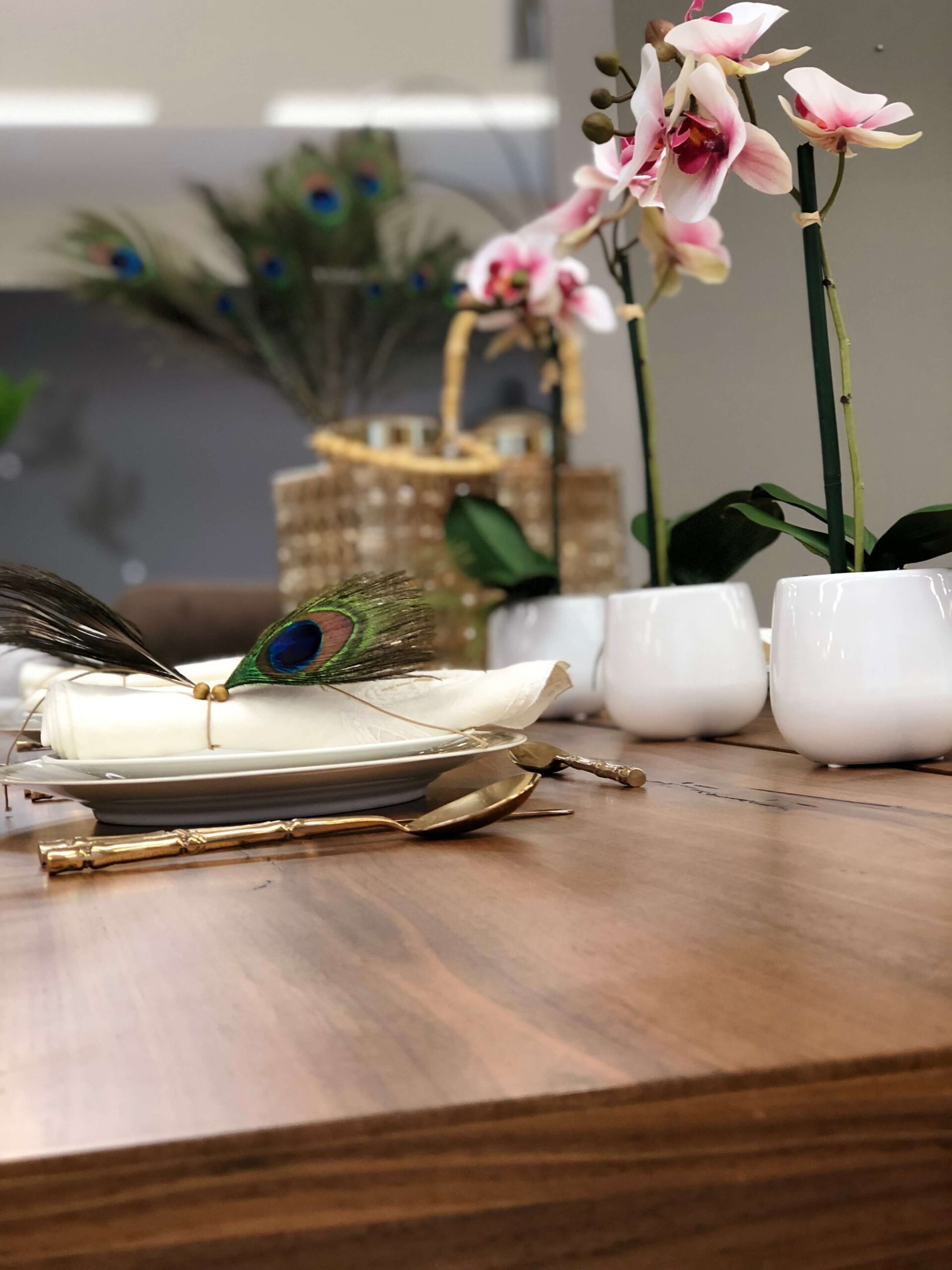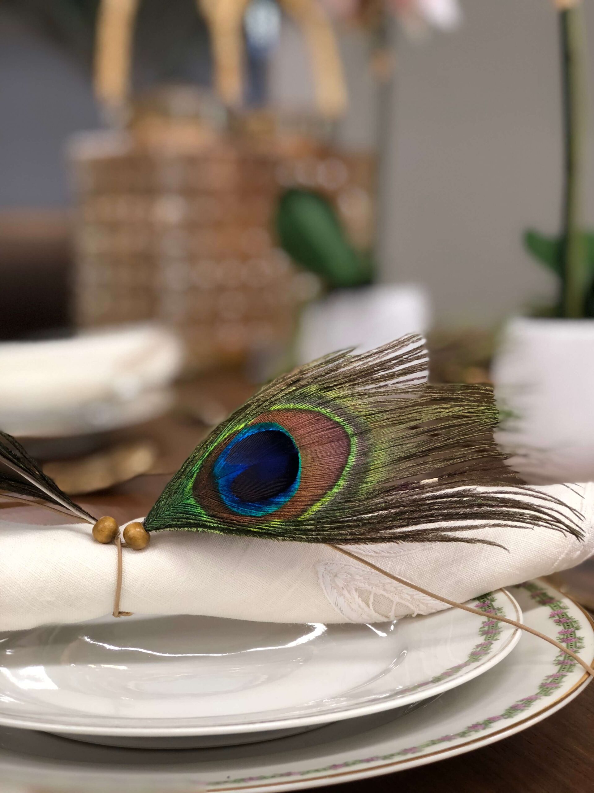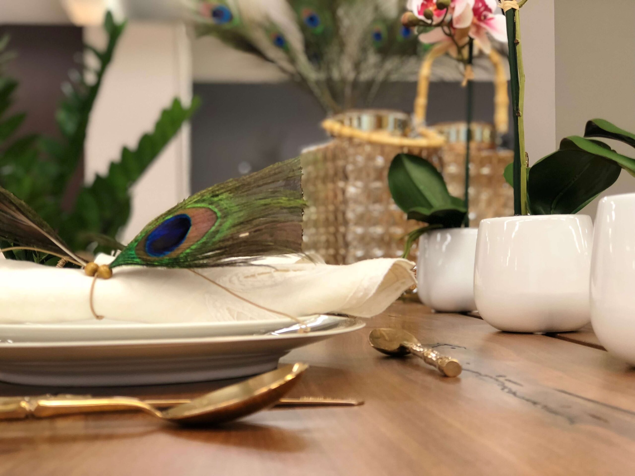 Εμείς ξεκινήσαμε από τα φτερά παγονιού τα οποία στόλισαν το βάζο που βάλαμε στο τραπέζι μας αλλά και τις πετσέτες φαγητού των καλεσμένων μας. Τα υπέροχα πρασινογάλαζα χρώματα στα φτερά “έδεσαν” υπέροχα με το vintage σερβίτσιο φαγητού με την χρυσή μπορντούρα και τα μοβ ανθάκια αλλά και με τα μαχαιροπήρουνα σε χρυσό χρώμα και σχήμα μπαμπού.