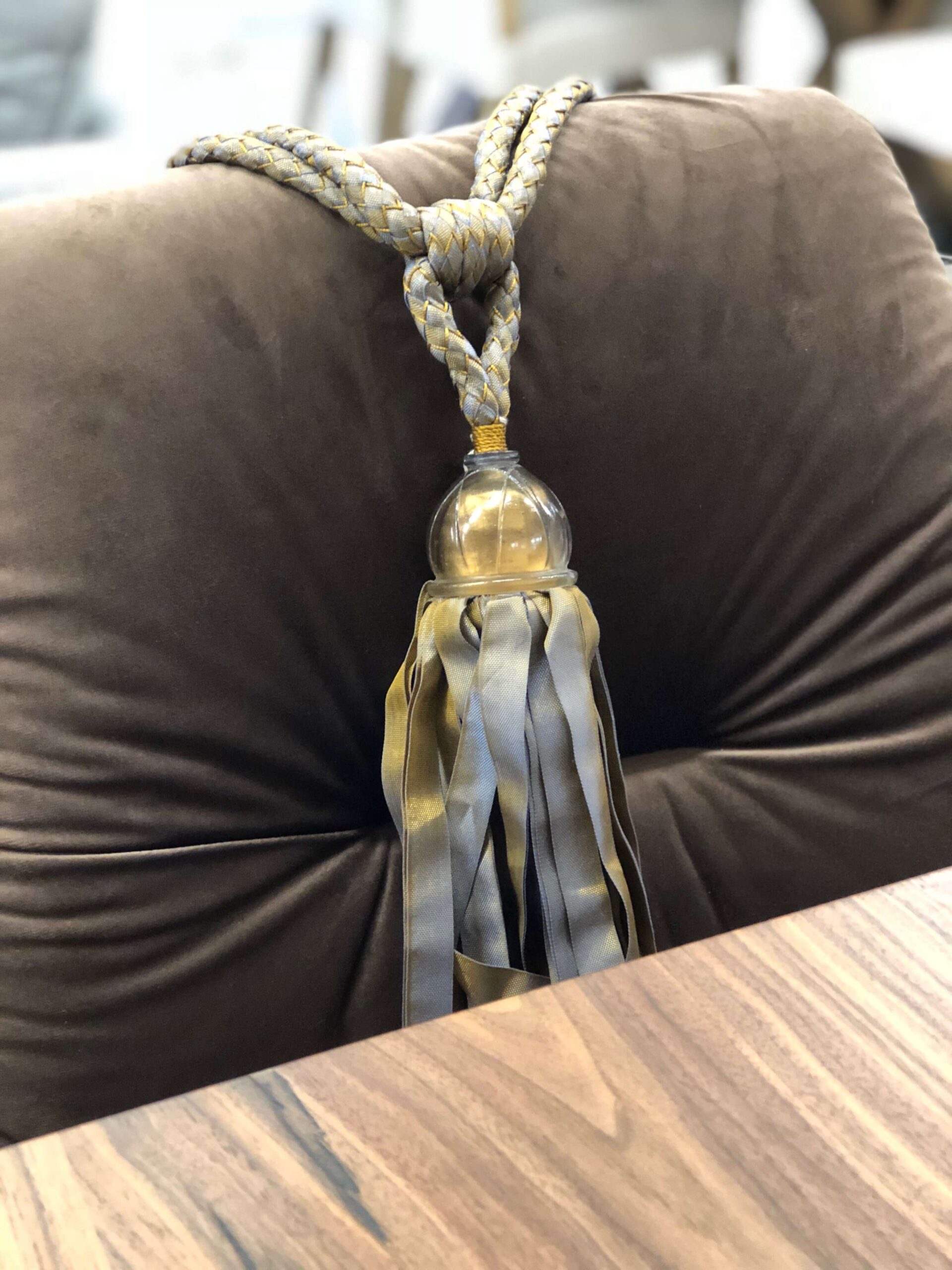 Στην κεντρική πολυθρόνα του τραπεζιού ή και σε όλες μπορείτε να ρίξετε διακοσμητικές φούντες όπως κάναμε κι εμείς. Οι έξυπνες αποχρώσεις του χρυσού παίζουν κι εδώ το ρόλο τους και δίνουν μια αίσθηση εορταστικής πολυτέλειας.