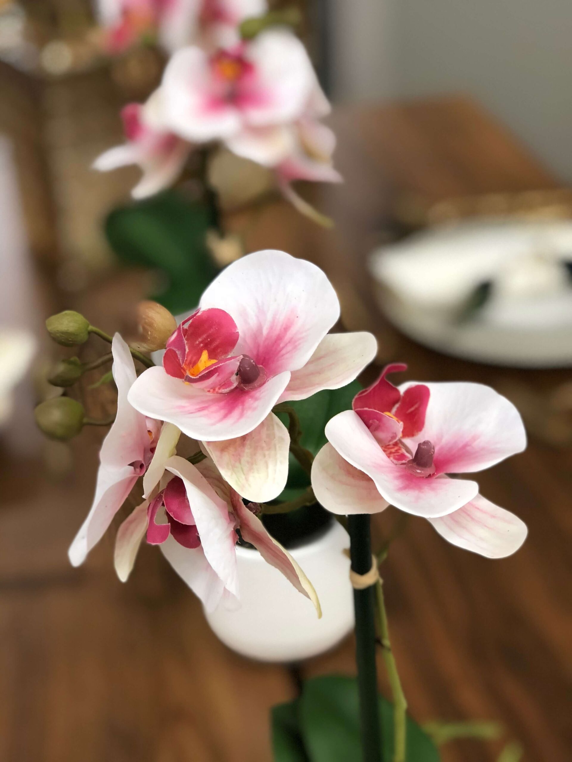 2 γυάλινα φανάρια στο χρώμα του κεχριμπαριού στόλισαν την άκρη του τραπεζιού μας. Οι γλυκές αντανακλάσεις του φωτός θα δώσουν μια αίσθηση ηρεμίας στους καλεσμένους σας. Στο κέντρο τραπεζιού μας τοποθετήσαμε μια σειρά από ορχιδέες σε ροζ χρώμα. Οι ροζ ορχιδέες αντιπροσωπεύουν τη χαρά, την ευτυχία και την αθωότητα. Ελπίζουμε οι άνθρωποι που θα κάτσουν στο τραπέζι σας να δίνουν όλα αυτά ή να τους τα χαρίζετε εσείς.