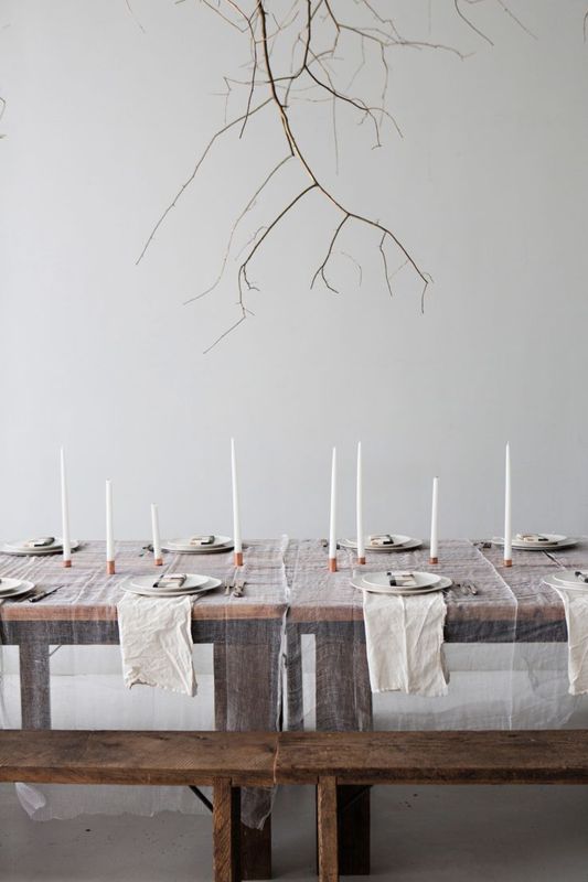 Μια λευκή διάφανη γάζα απλωμένη στο ξύλινο τραπέζι σας, και μερικά λευκά κεριά σε διαφορετικά μεγέθη θα προσδώσουν έναν αέρα απλότητας αλλά και μυστηρίου στο γεύμα σας!