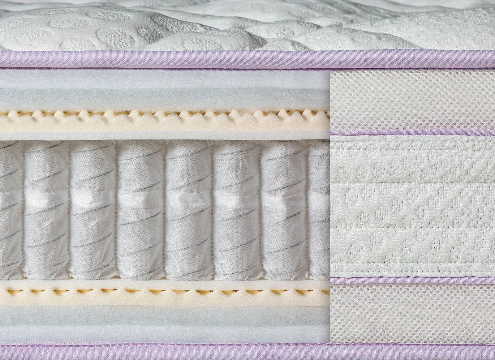 Η ανεξάρτητη στήριξη σώματος από τα στρώματα advance που γίνεται χάρη στα ελατήρια Pocket Springs σε συνδυασμό με την περιμετρική ζώνη αερισμού 3D AirControl zone, την περιφερειακή ζώνη προστασίας Side Support Plus και την αντιμικροβιακή επεξεργασία Sanitized Hygiene Function, υπόσχονται υγιεινό και ασφαλή ύπνο. Τα πλούσια σχέδια καπιτονέ στα στρώματα ύπνου ντύνονται με πλεκτά ελαστικά υφάσματα με κομψά χαρακτηριστικά. Η «ήσυχη» και ταυτόχρονα έντονη προσωπικότητά τους, ενισχύεται από τις λιλά λεπτομέρειες που αποπνέουν φρεσκάδα.