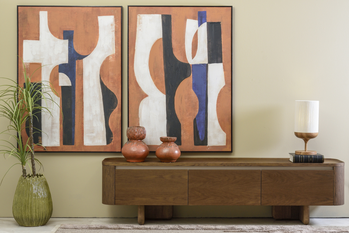 Αφηρημένο θέμα σε πίνακες βελγικής προέλευσης, με ζωηρές μοντέρνες αποχρώσεις σε τερακότα, λευκό, μαύρο και μπλε.