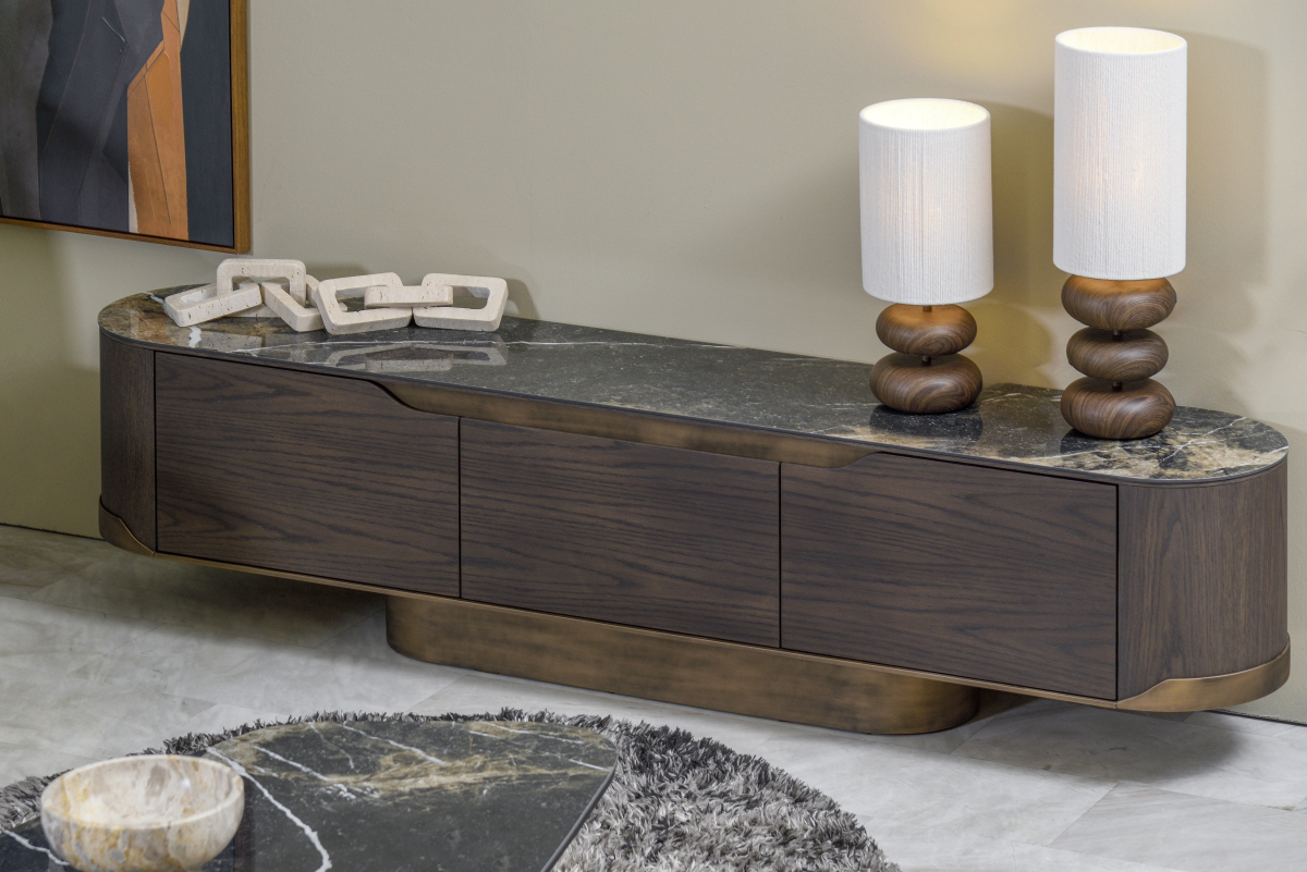 Έπιπλο τηλεόρασης κατασκευασμένο από καμπυλωμένη ριγέ δρυ, μπρονζέ μεταλλικά πόδια και γυαλιστερή κεραμική επιφάνεια που προσδίδει πολυτέλεια.