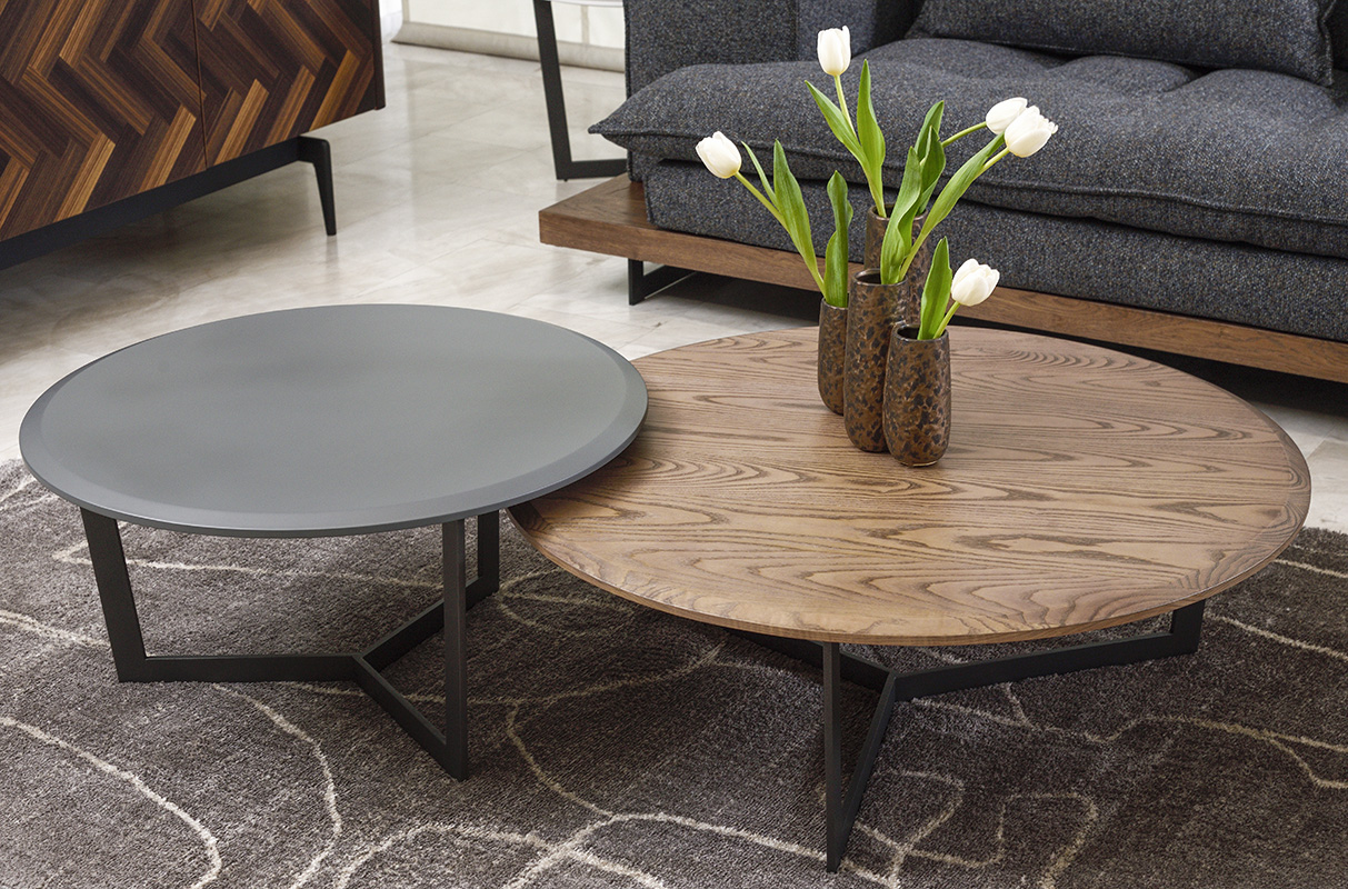 Στρόγγυλα τραπεζάκια σαλονιού με ανθρακί μεταλλικές βάσεις.