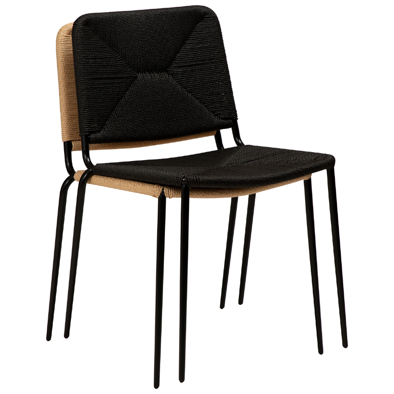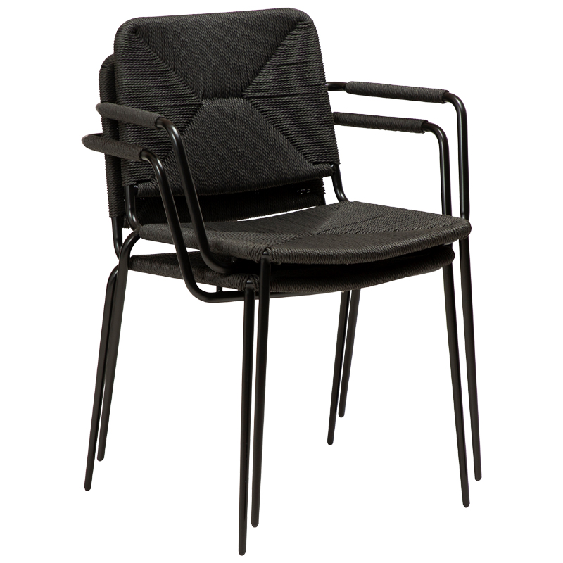 Στοιβαζόμενο πολυθρονάκι τραπεζαρίας με μαύρο μεταλλικό σκελετό και χειροποίητο δέσιμο ψάθας στο κάθισμα, την πλάτη και τα μπράτσα του Δανέζικου οίκου DANFORM .