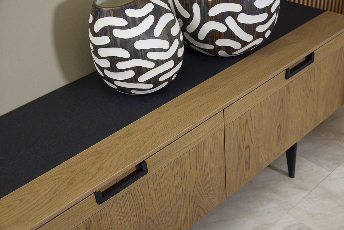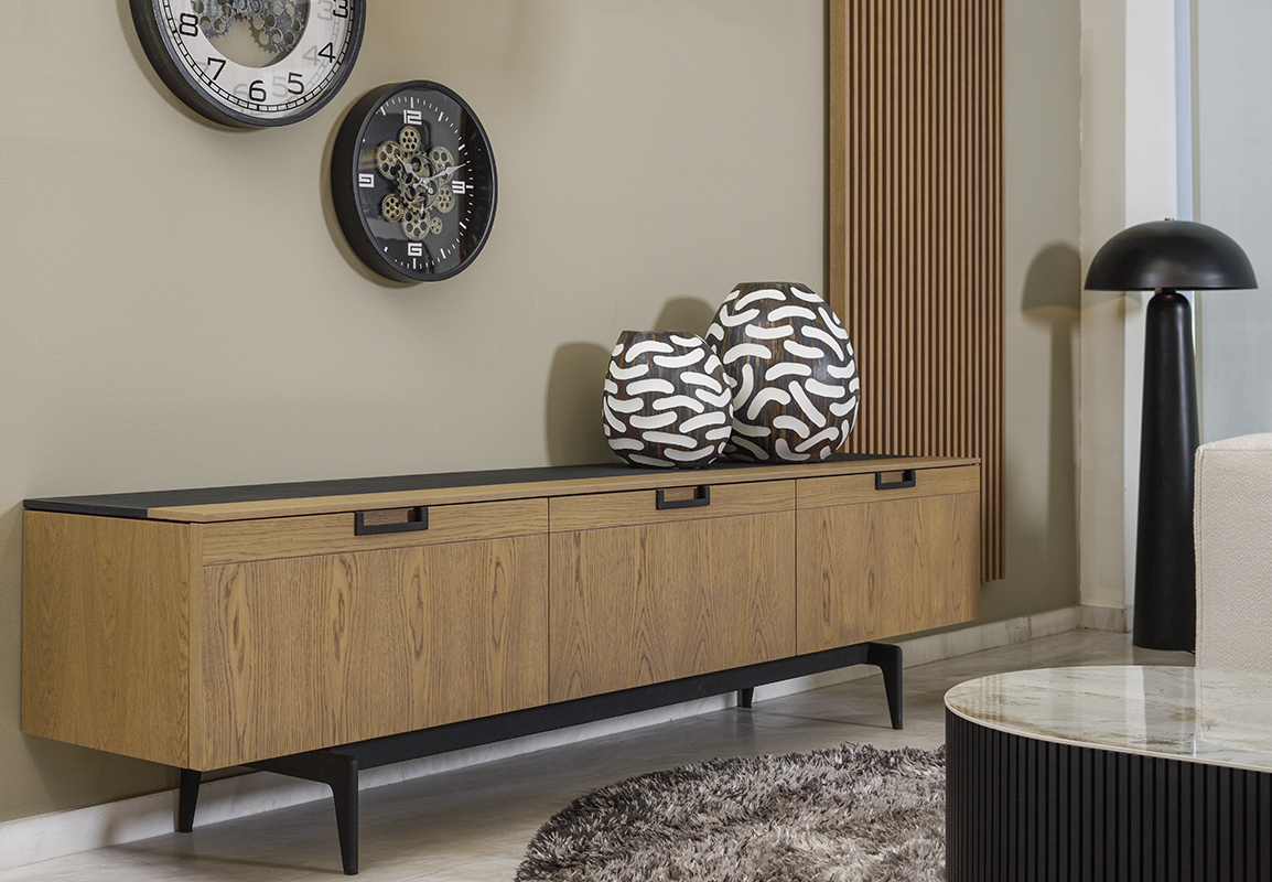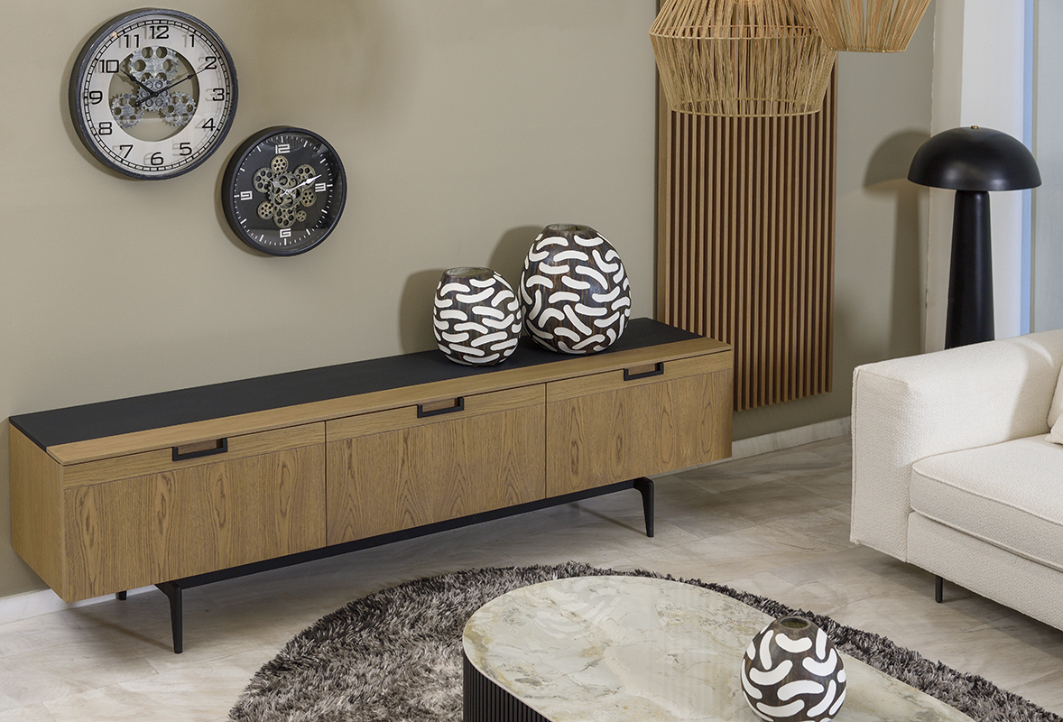 Έπιπλο τηλεόρασης κατασκευασμένο από ξύλο δρυός, μαύρα ξύλινα πόδια και μαύρη επιφάνεια σε εφέ φυσικής πέτρας. Οι πόρτες λειτουργούν με μηχανισμούς soft-close για αθόρυβη χρήση. Παράγεται και με κεραμικό καπάκι. Επιλέξτε ανάμεσα σε αμέτρητες αποχρώσεις δρυός, λάκας και 6 διαφορετικές κεραμικές επιφάνειες ώστε να συνθέσετε το δικό σας μοναδικό αποτέλεσμα.