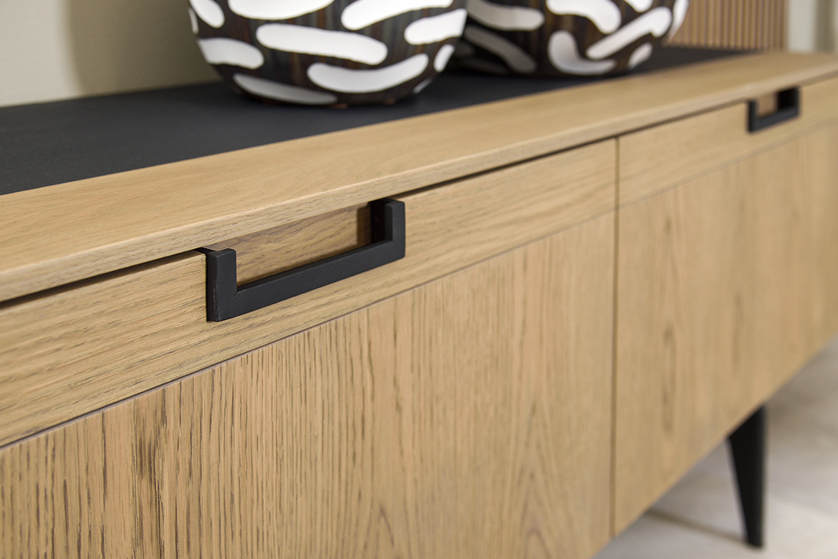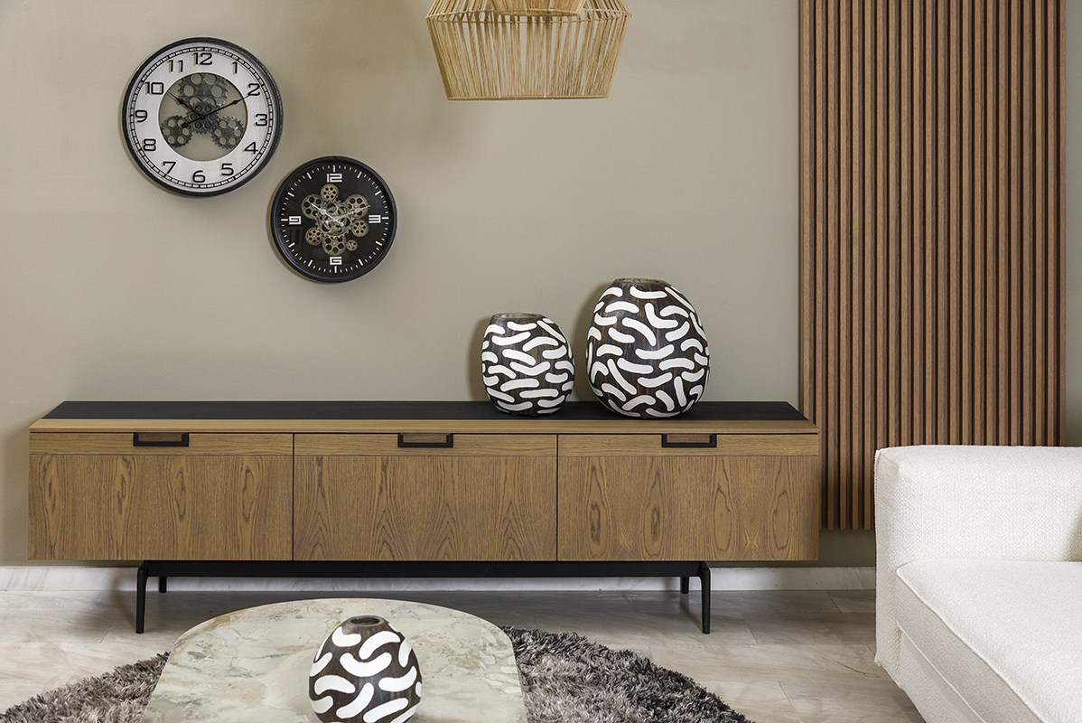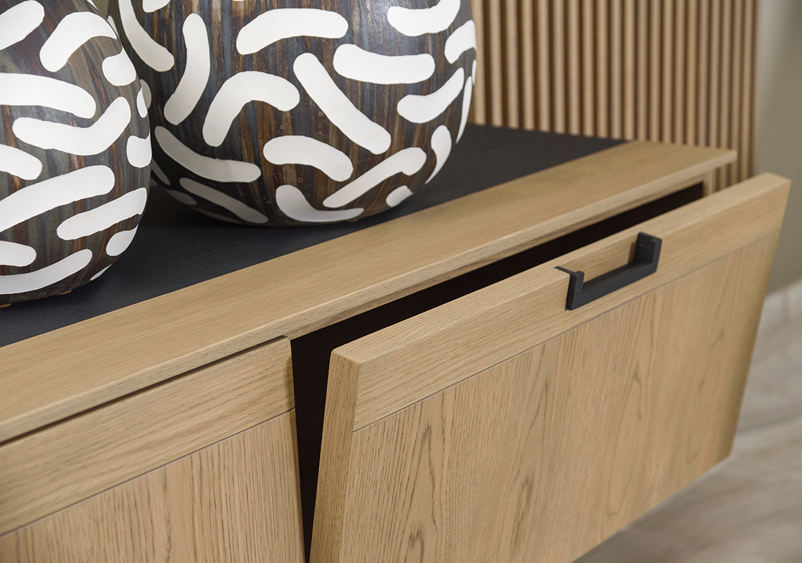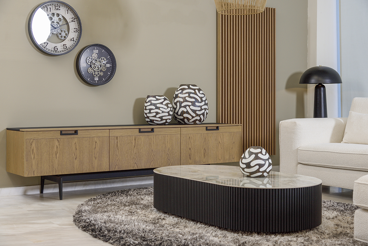 Έπιπλο τηλεόρασης κατασκευασμένο από ξύλο δρυός, μαύρα ξύλινα πόδια και μαύρη επιφάνεια σε εφέ φυσικής πέτρας. Οι πόρτες λειτουργούν με μηχανισμούς soft-close για αθόρυβη χρήση. Παράγεται και με κεραμικό καπάκι. Επιλέξτε ανάμεσα σε αμέτρητες αποχρώσεις δρυός, λάκας και 6 διαφορετικές κεραμικές επιφάνειες ώστε να συνθέσετε το δικό σας μοναδικό αποτέλεσμα.