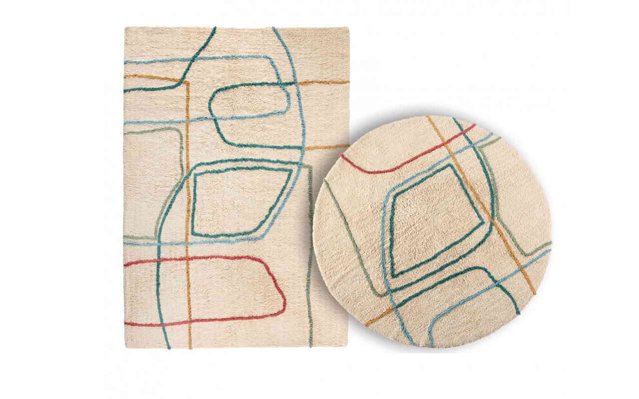 Χειροποίητο εκρού χαλί με χρωματιστές γραμμές από 100% βαμβάκι. Υφαίνεται στην Ινδία με παραδοσιακές μεθόδους, λαμβάνοντας υπόψη τη κοινωνική και οικολογική βιωσιμότητα. Διατίθεται σε ορθογώνιο και στρογγυλό σχήμα. Επιλέξτε αυτό που θα αναδείξει καλύτερα τον χώρο σας.