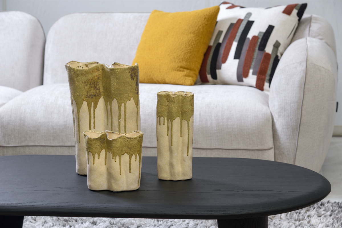 Σετ τριών βάζων σε διαφορετικά μεγέθη με ιδιαίτερο, οργανικό σχήμα και κυματιστό στόμιο. Χαρακτηρίζονται από την εντυπωσιακή διχρωμία τους, όπου μια πλούσια λαδί υαλώδης στρώση μοιάζει να «ρέει» πάνω στην τραχιά, αμμουδερή βάση τους. Ένα κομμάτι με έντονη υφή που συνδυάζει την παραδοσιακή κεραμική με τη σύγχρονη αισθητική.