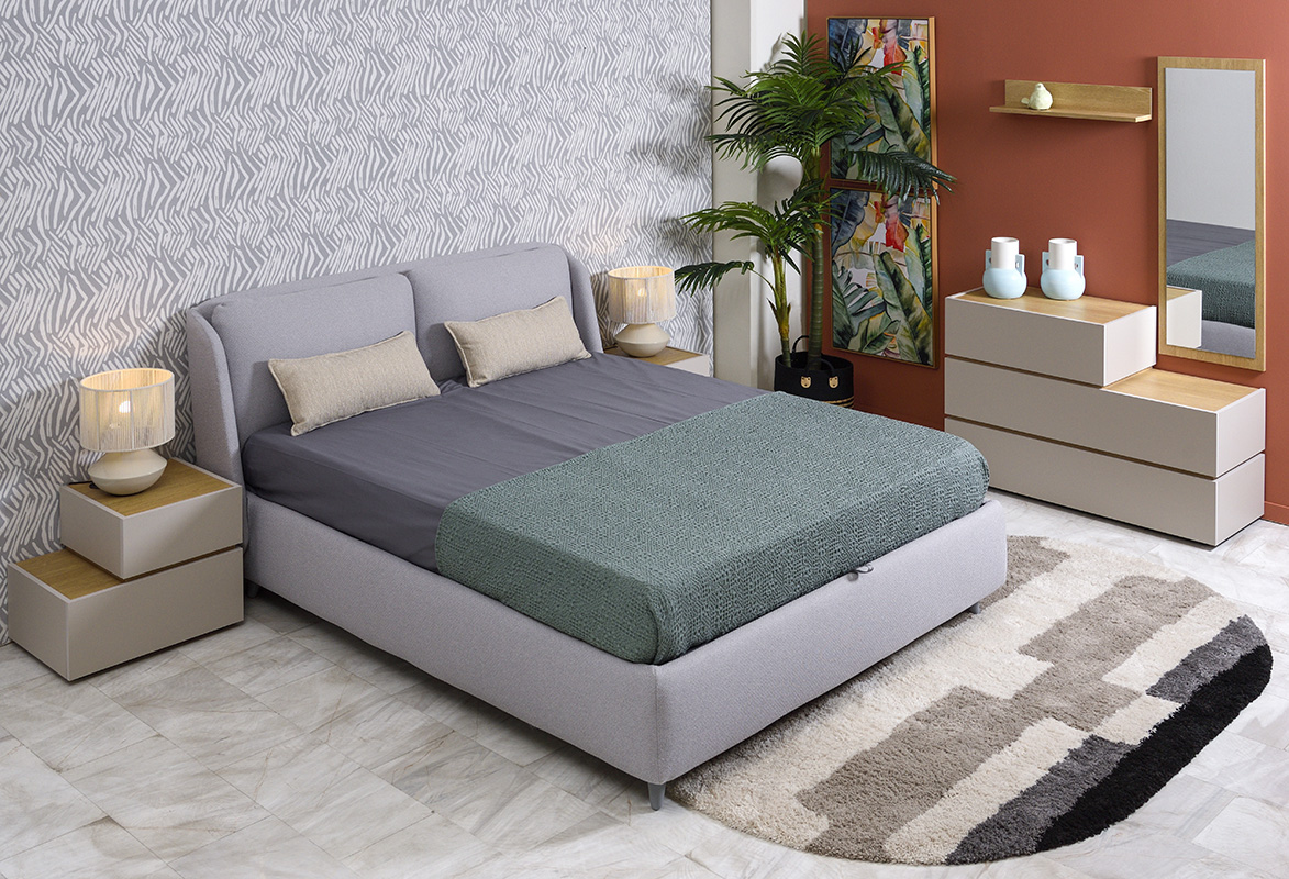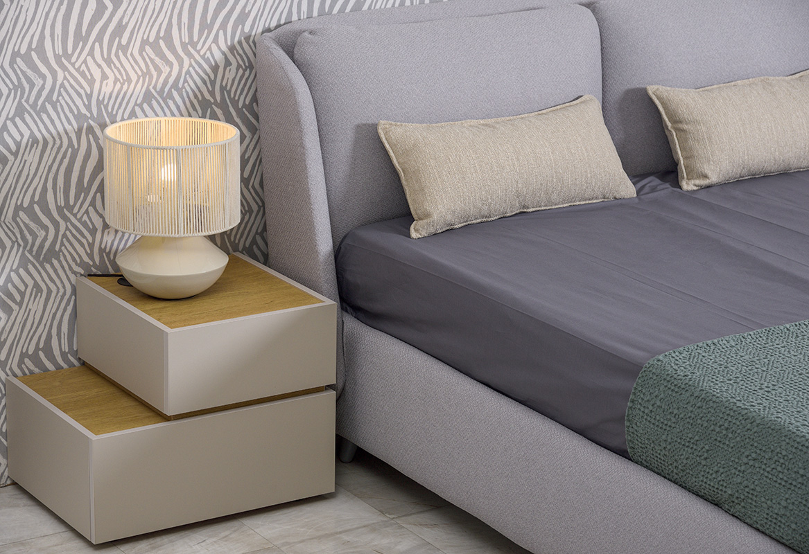 Κομοδίνο κρεβατοκάμαρας δυο επιπέδων, κατασκευασμένο από 3d μελαμίνη και απομίμηση τεχνοτροπίας τσιμέντου. Προσθέστε προαιρετικά φορτιστή usb και μηχανισμούς soft-close στα συρτάρια, για αθόρυβη χρήση. Παράγονται σε 2 διαστάσεις 0,60 και 0,50. Επιλέξτε ανάμεσα σε καρυδί, light grey ή φυσική απόχρωση.