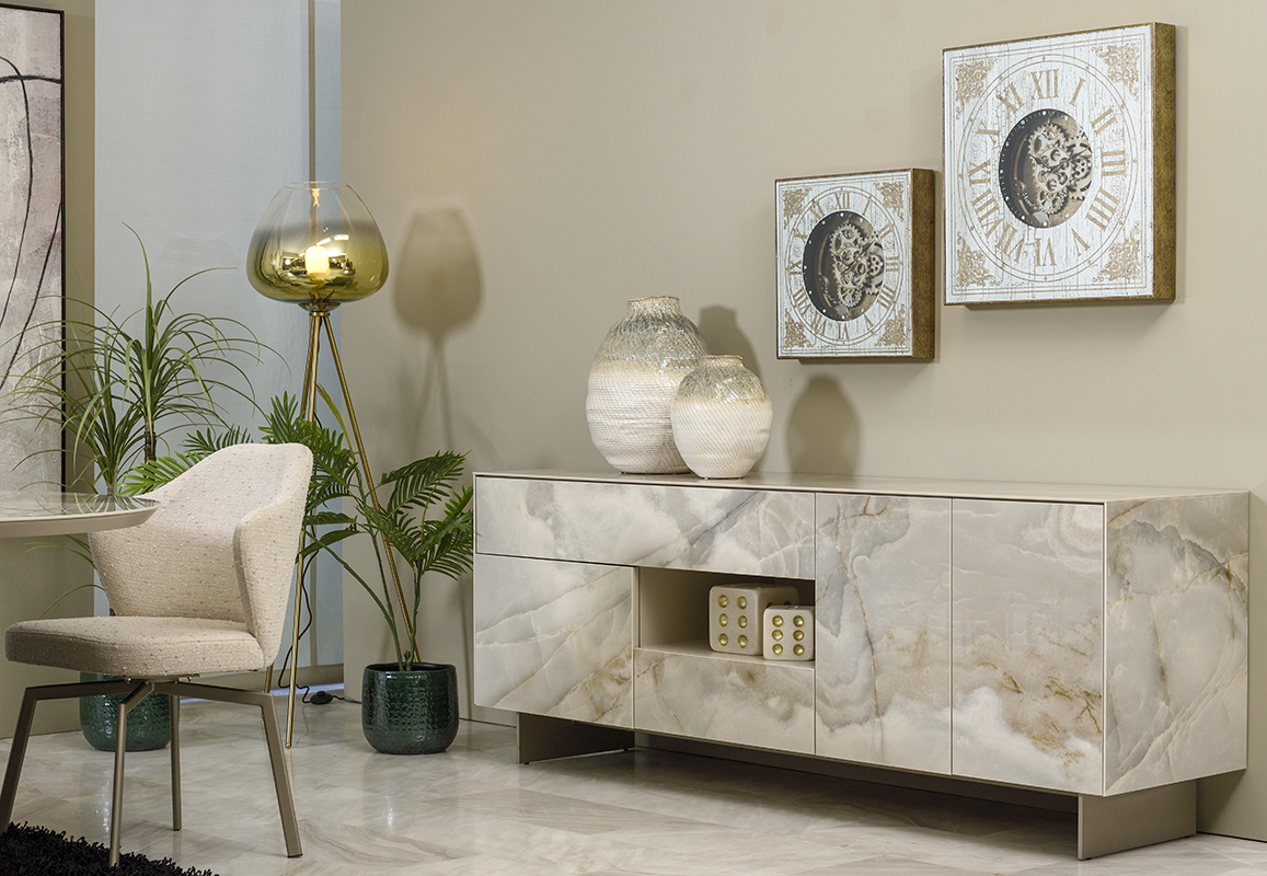 Μπουφές τραπεζαρίας επενδεδυμένος εξ ολοκλήρου με γυαλιστερή κεραμική επιφάνεια. Τα στοιχεία των λακαριστών ξύλινων επιφανειών, αλλά και των μεταλλικών ποδιών υποστηρίζουν την κομψότητα του συνόλου. Το εντυπωσιακό τελικό αποτέλεσμα ενός “μαρμάρινου” μπουφέ είναι αδιαμφισβήτητα πολυτελές και μαγνητίζει τα βλέμματα. Οι πόρτες και τα συρτάρια λειτουργούν με μηχανισμούς push-pull για αθόρυβη χρήση. Επιλέξτε ανάμεσα σε 16 διαφορετικές κεραμικές επιφάνειες και 10 αποχρώσεις μετάλλων ώστε να συνθέσετε το δικό σας μοναδικό αποτέλεσμα. Συνδυάστε τον με την τραπεζαρία Fat Boy για να απογειώσετε τον χώρο σας.