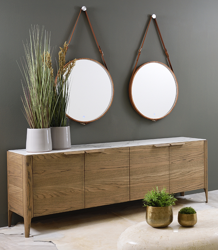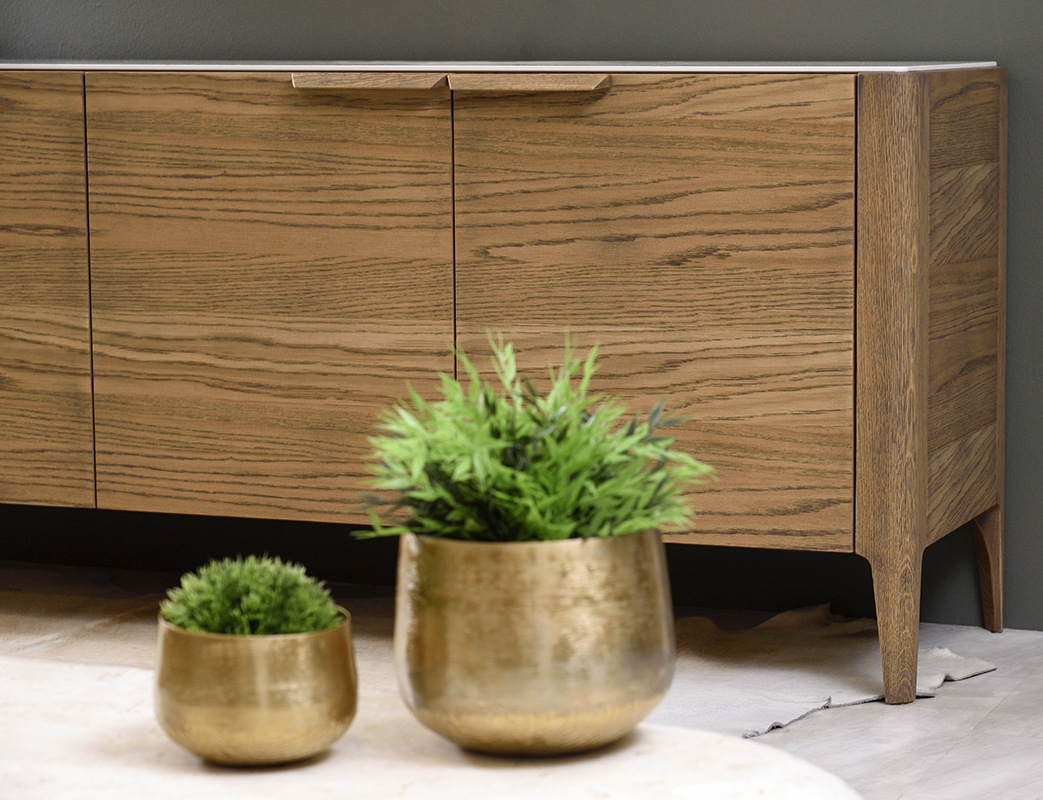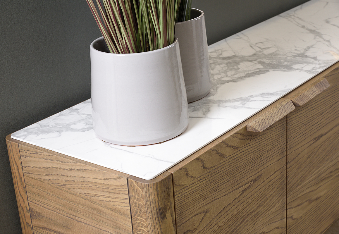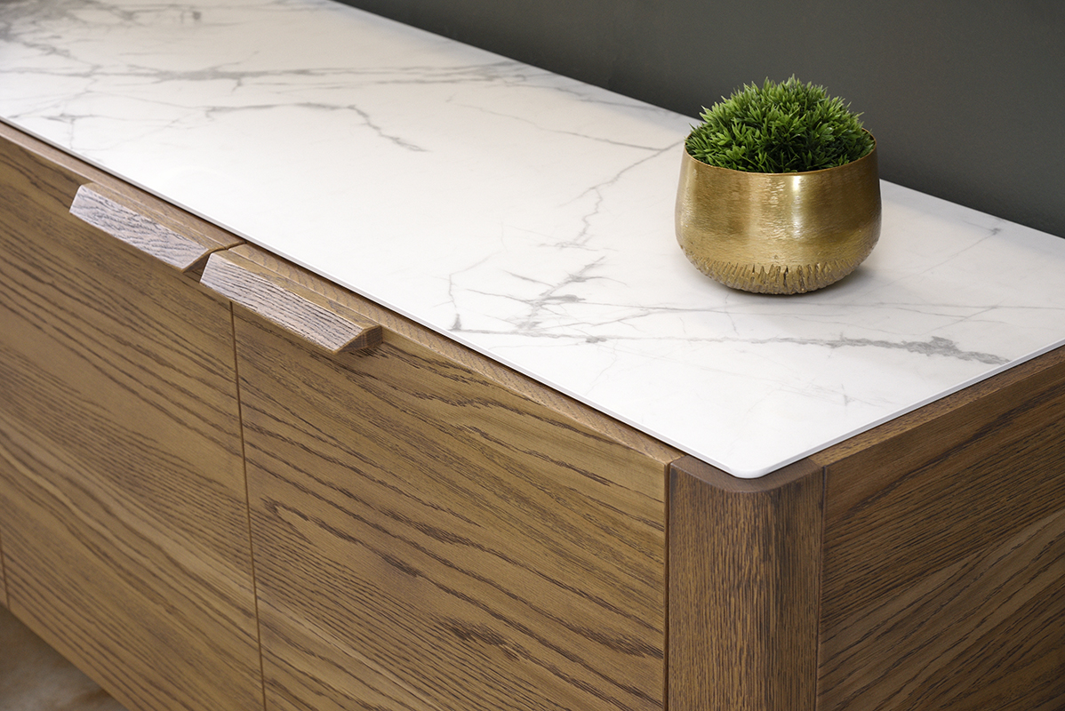 Μπουφές κατασκευασμένος από ξύλο δρυός και μασίφ δρύινες λεπτομέρειες,  βαμμένος με χειροποίητη τεχνική πατίνας. Η λευκή velvet κεραμική επιφάνεια στο καπάκι του ολοκληρώνει την άψογη αισθητική του. Το καπάκι μπορεί να παραμείνει δρύινο για τους λάτρεις του ξύλου. Οι πόρτες λειτουργούν με μηχανισμούς soft-close για αθόρυβη χρήση. Παράγεται σε ποικιλία διαστάσεων, αποχρώσεων ξύλου και κεραμικού.
