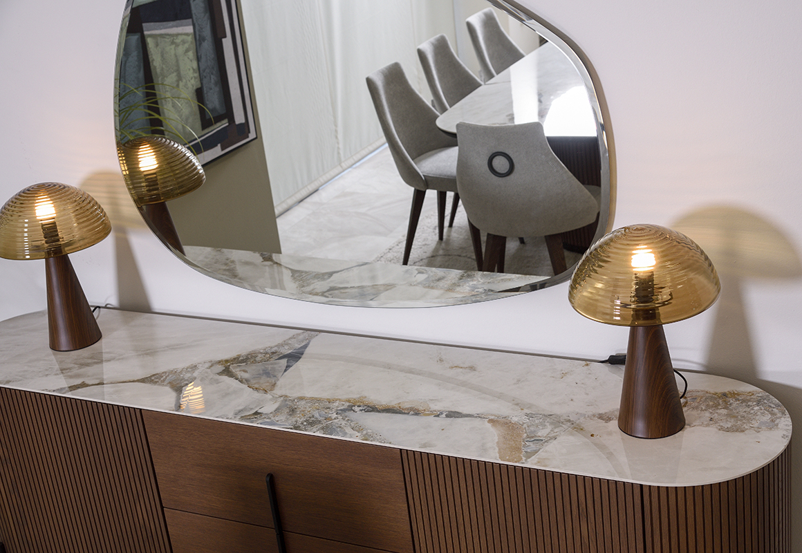 Μπουφές τραπεζαρίας κατασκευασμένος από καμπυλωμένη ριγέ δρυ, μαύρα μεταλλικά πόδια και γυαλιστερή κεραμική επιφάνεια που προσδίδει πολυτέλεια. Οι πόρτες και τα συρτάρια λειτουργούν με μηχανισμούς soft-close για αθόρυβη χρήση. Παράγεται και με δρύινο καπάκι για τους λάτρεις του ξύλου. Επιλέξτε ανάμεσα σε αμέτρητες αποχρώσεις δρυός και 6 διαφορετικές κεραμικές επιφάνειες ώστε να συνθέσετε το δικό σας μοναδικό αποτέλεσμα. Συνδυάστε τον με την τραπεζαρία Noir για ολοκληρωμένο αποτέλεσμα.
