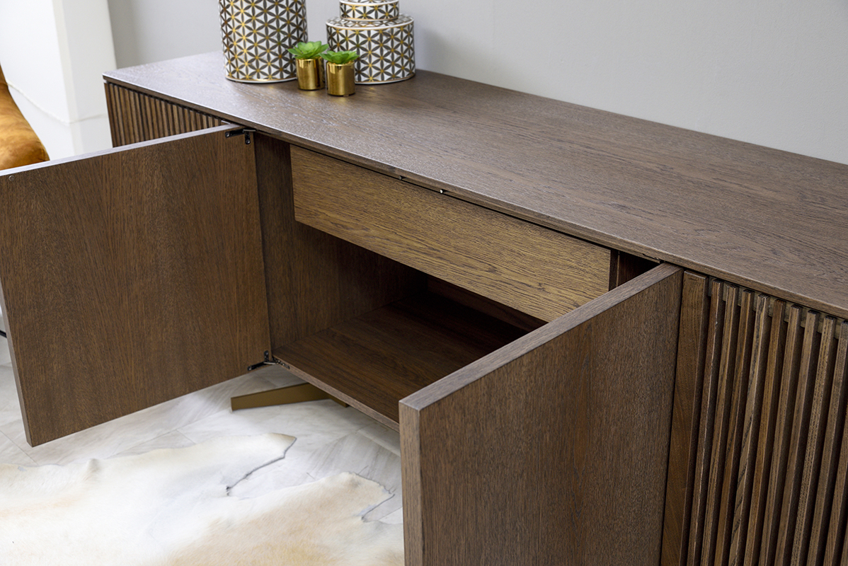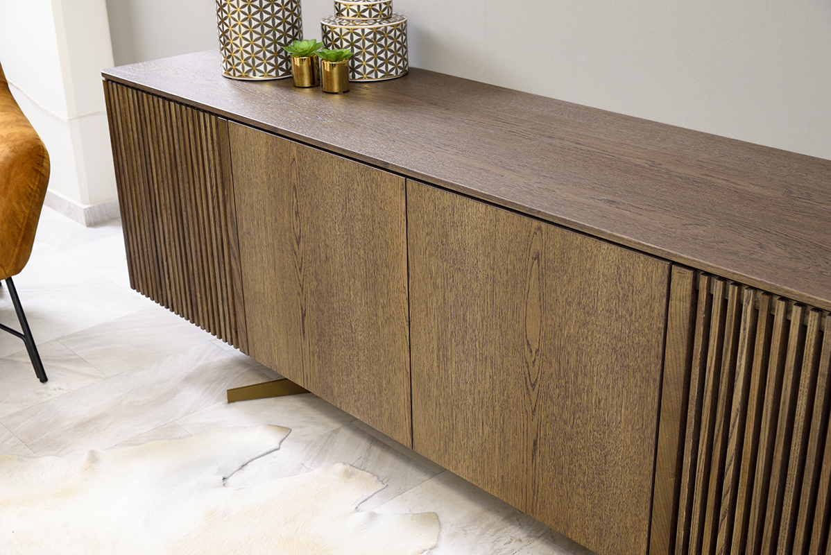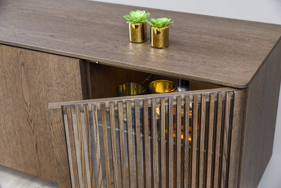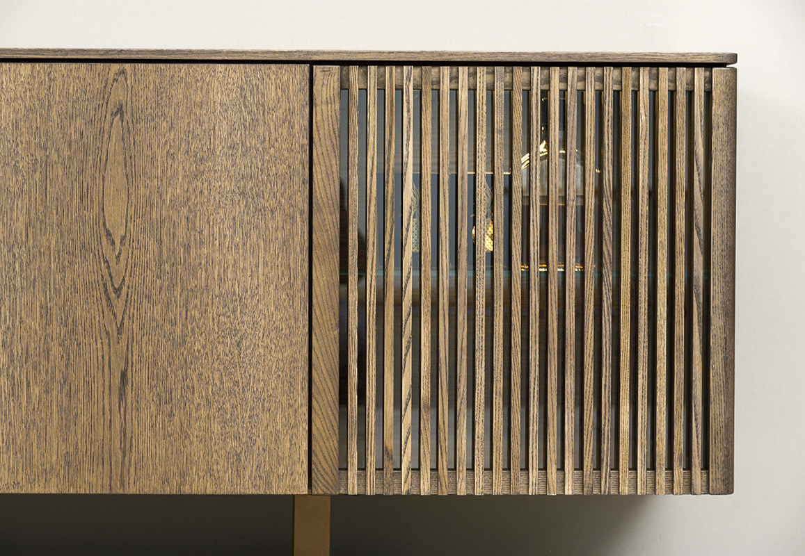 Μπουφές με χρυσή μεταλλική βάση ιδιαίτερου σχεδιασμού. Είναι κατασκευασμένος από ξύλο δρυός με μασίφ λεπτομέρειες στις ημιδιάφανες πόρτες του. Το εσωτερικό του φωτίζεται με led και έχει κρυφούς μηχανισμούς soft-close στις πόρτες και το συρτάρι για αθόρυβη χρήση. Παράγεται σε ποικιλία διαστάσεων, αποχρώσεων ξύλου και κεραμικού.