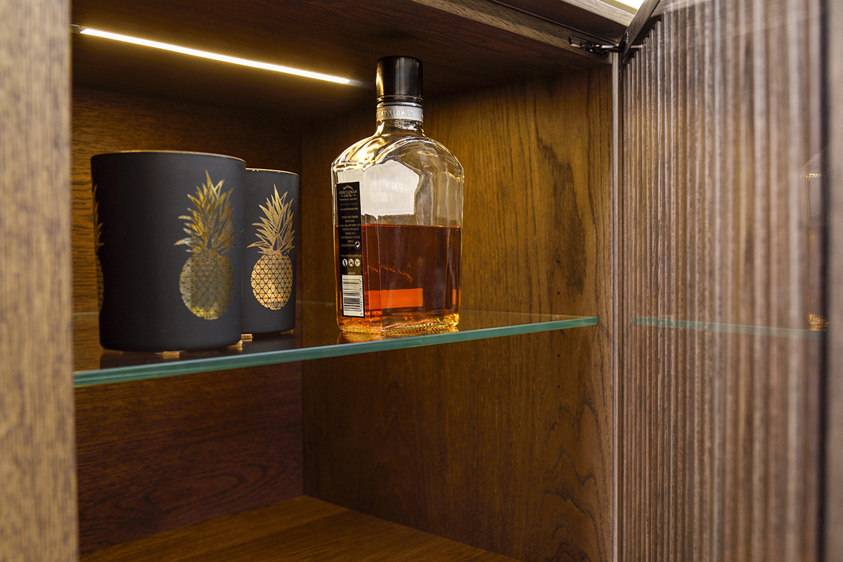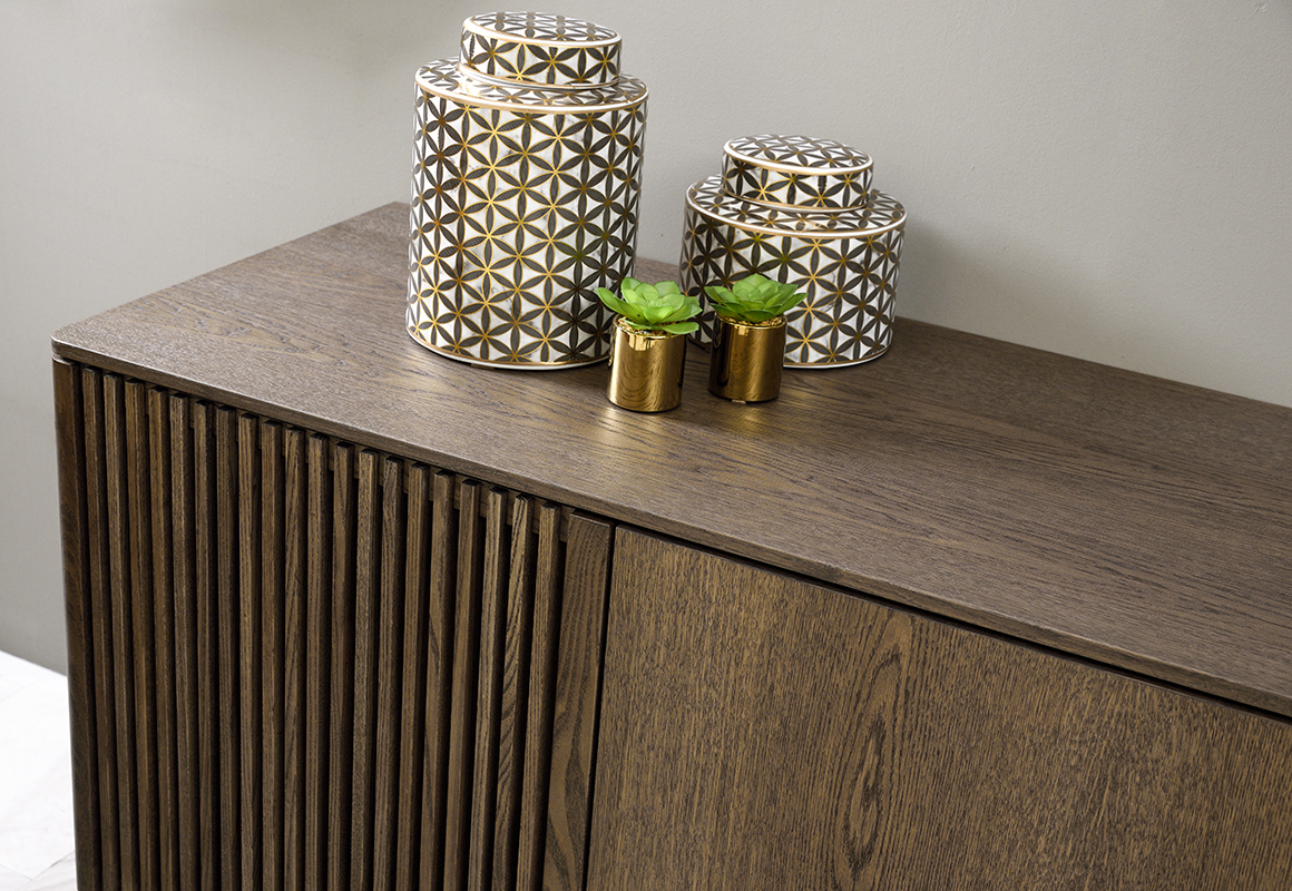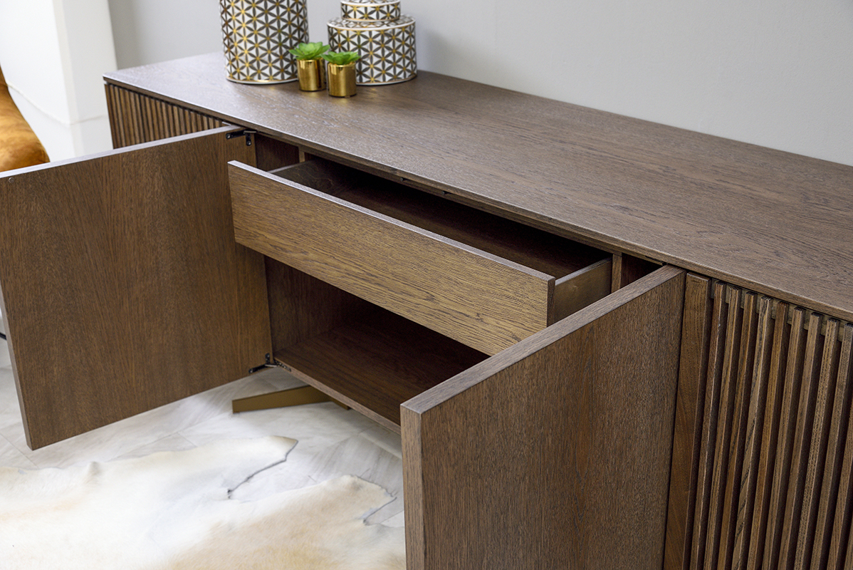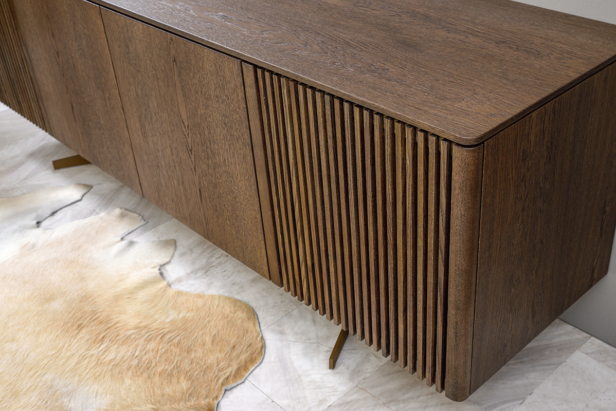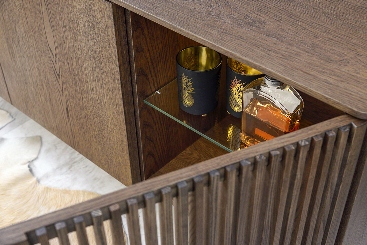 Μπουφές με χρυσή μεταλλική βάση ιδιαίτερου σχεδιασμού. Είναι κατασκευασμένος από ξύλο δρυός με μασίφ λεπτομέρειες στις ημιδιάφανες πόρτες του. Το εσωτερικό του φωτίζεται με led και έχει κρυφούς μηχανισμούς soft-close στις πόρτες και το συρτάρι για αθόρυβη χρήση. Παράγεται σε ποικιλία διαστάσεων, αποχρώσεων ξύλου και κεραμικού.
