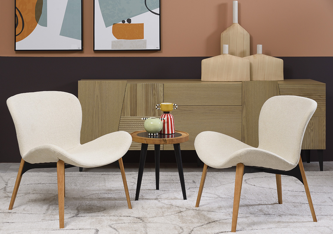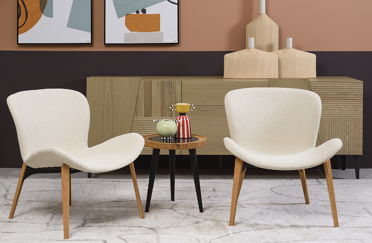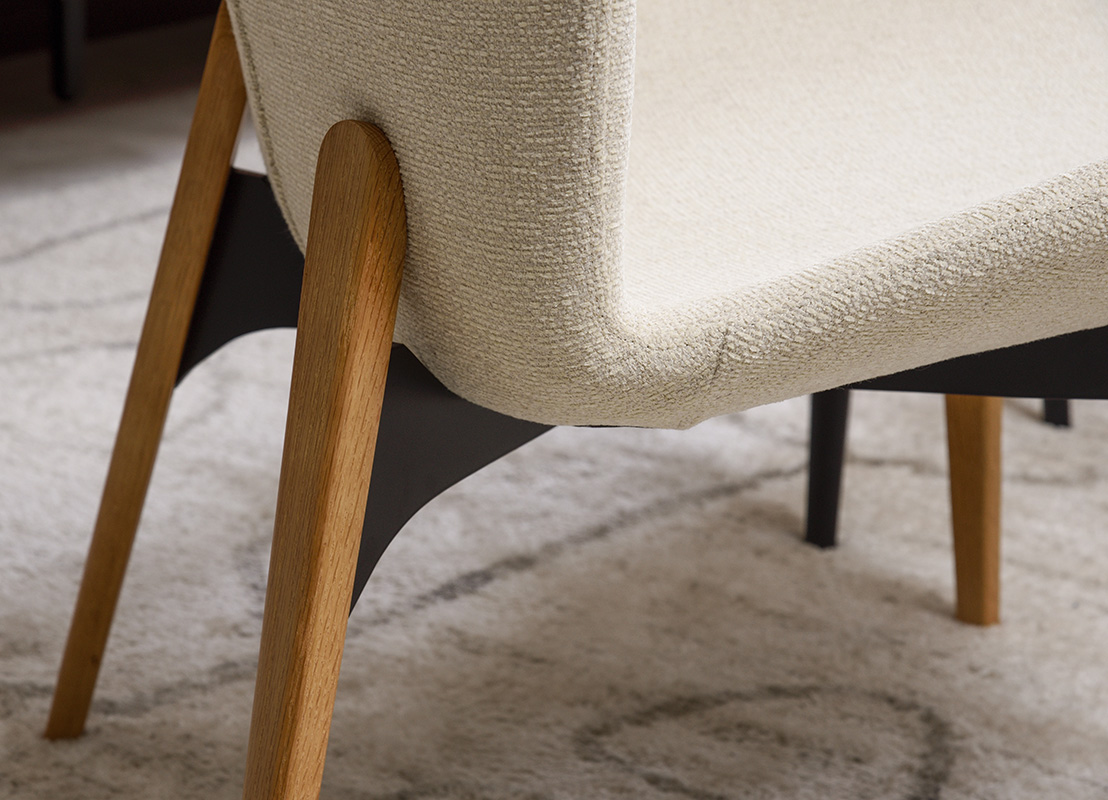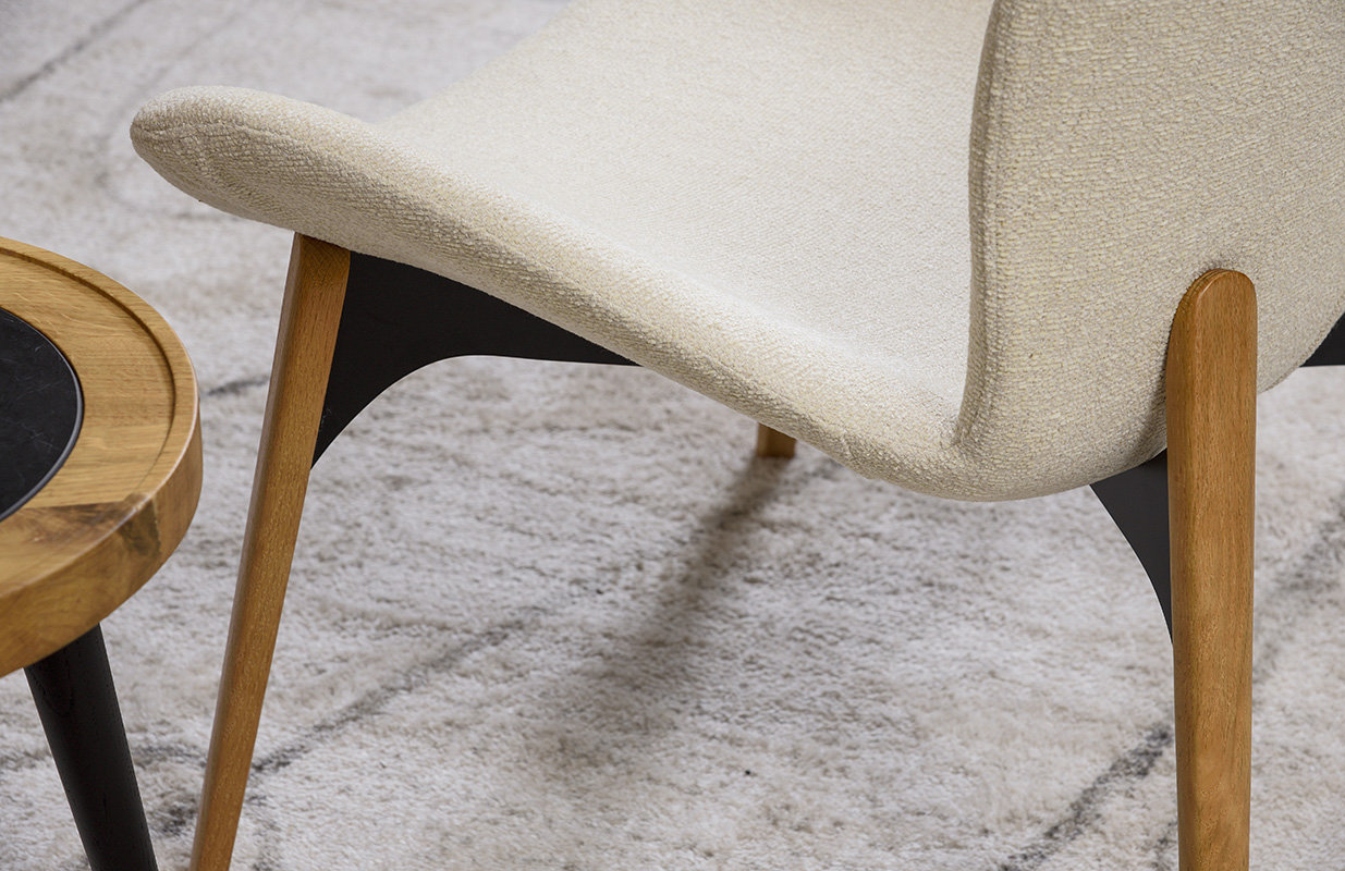 Δανέζικη πολυθρόνα με μεταλλικό σκελετό και δρύινα πόδια σε φυσική απόχρωση. Είναι ντυμένη με λευκό μπουκλέ ύφασμα.
