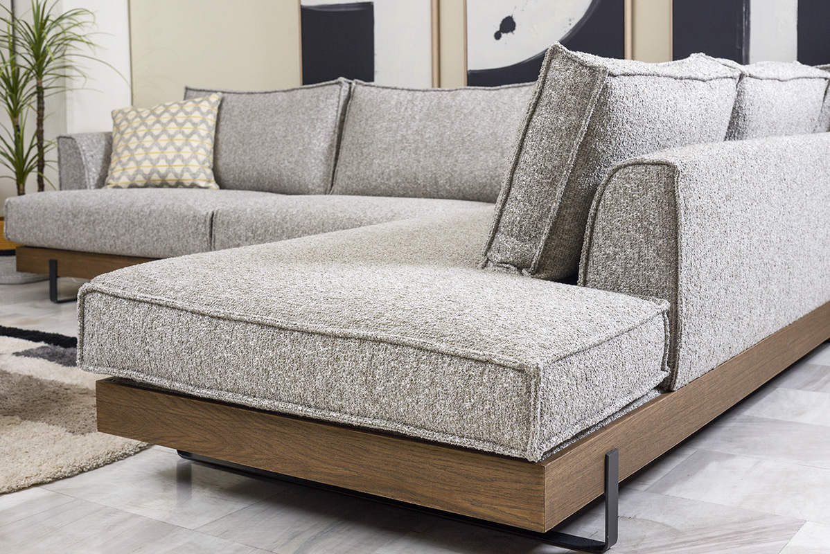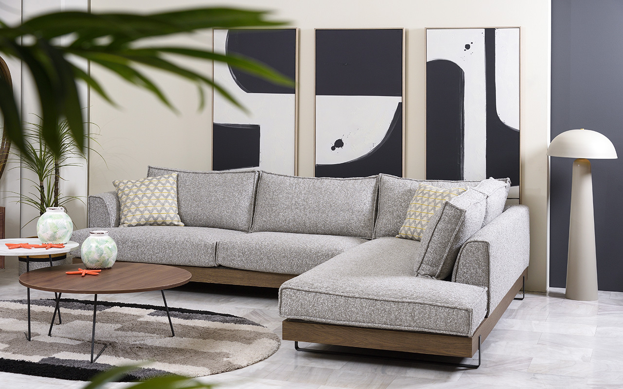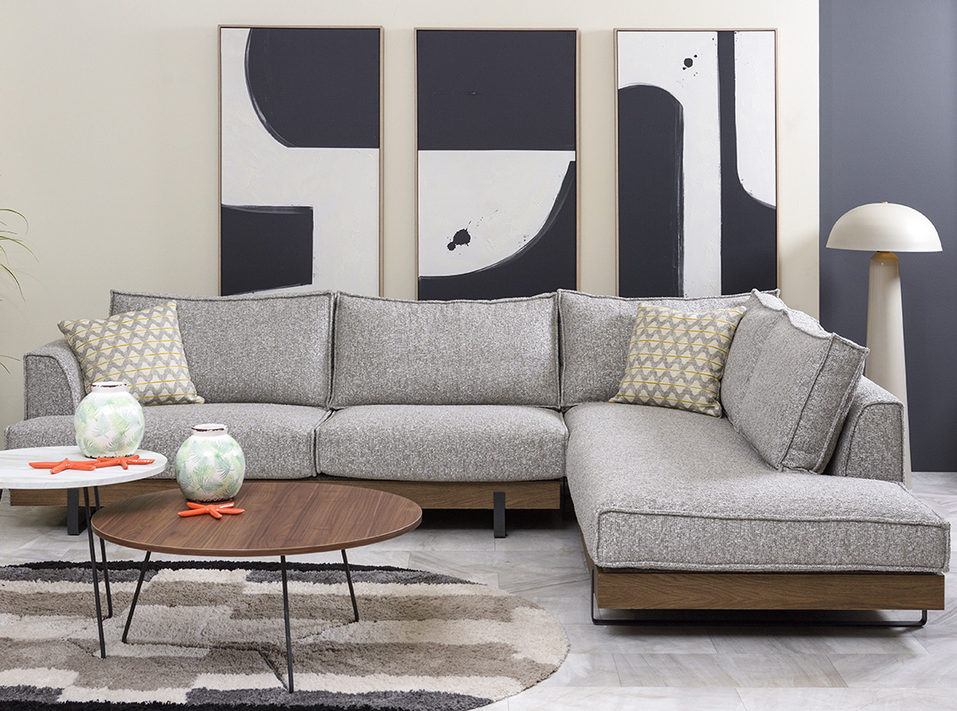 Γωνιακός καναπές με βάση από ξύλο δρυός και ανθρακί μεταλλικά πόδια. Το ύφασμα είναι πλενόμενο και μπορεί να αφαιρεθεί από όλα τα μαξιλάρια του καναπέ για ευκολία στο πλύσιμο και τη συντήρηση. Παράγεται σε ποικιλία διαστάσεων, αποχρώσεων ξύλου, μετάλλου και υφασμάτων.