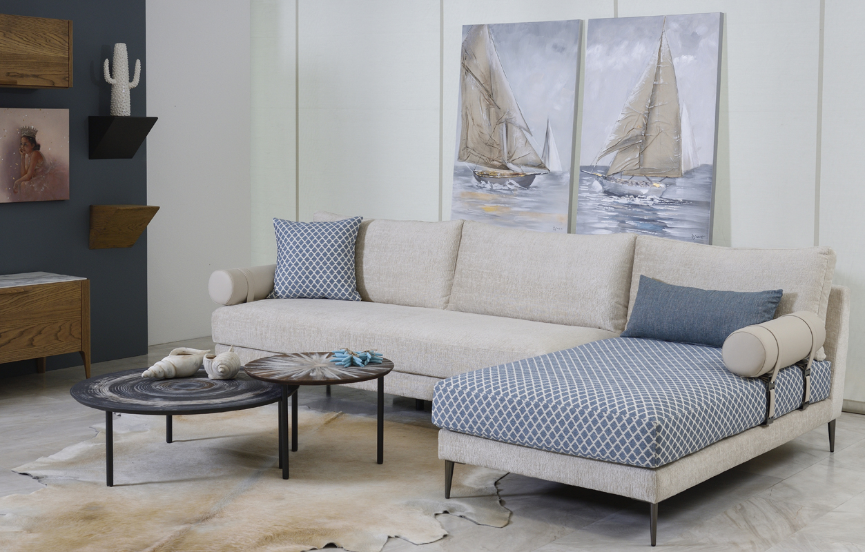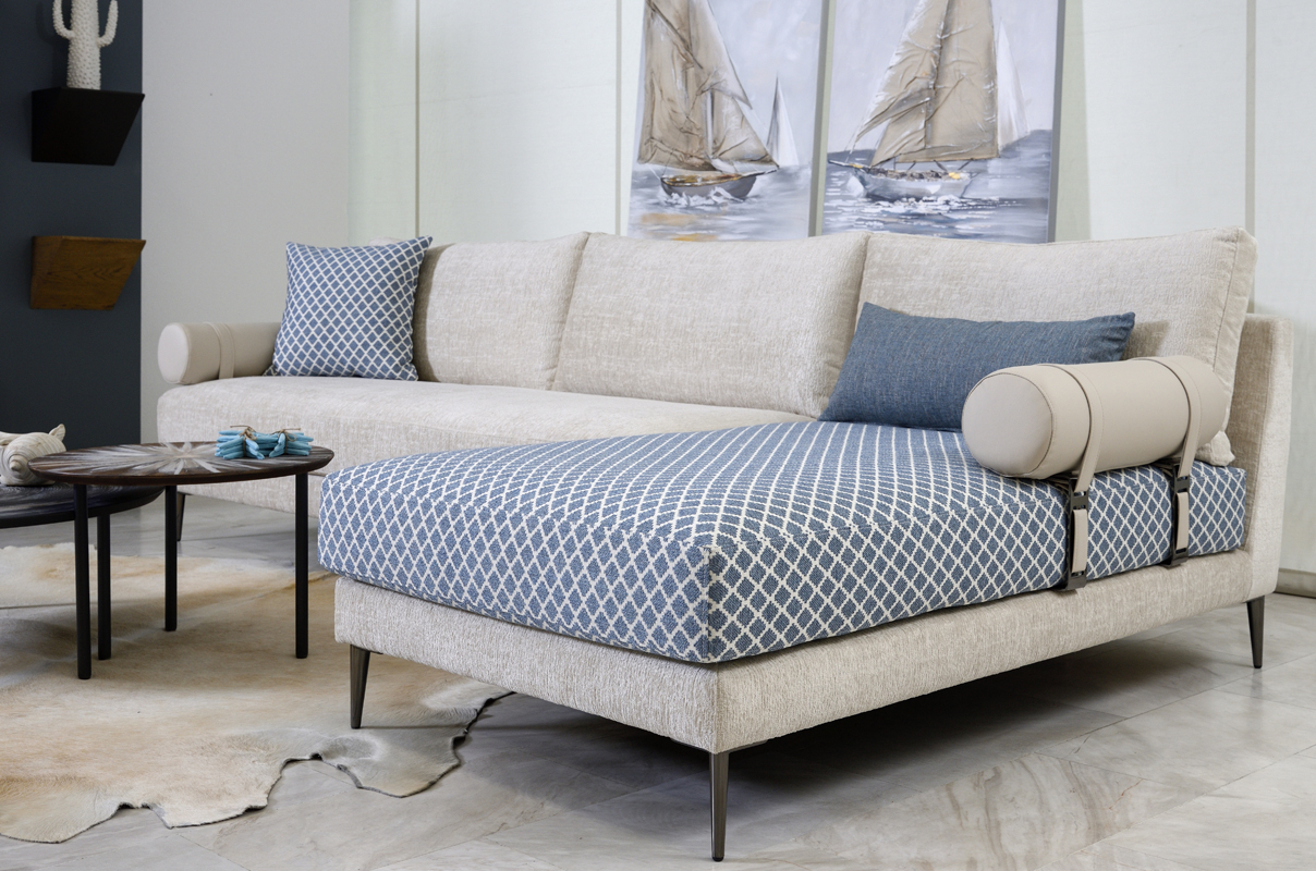 Πολυμορφικός γωνιακός καναπές με μεταλλικά πόδια. Τα μπράτσα του σε σχήμα κυλίνδρου είναι σχεδιασμένα έτσι ώστε να τοποθετούνται στη θέση που σας βολεύει. Το ύφασμα είναι πλενόμενο και μπορεί να αφαιρεθεί από όλα τα μαξιλάρια του καναπέ για ευκολία στο πλύσιμο και τη συντήρηση. Παράγεται σε ποικιλία διαστάσεων, αποχρώσεων μετάλλου, αλλά και υφασμάτων.