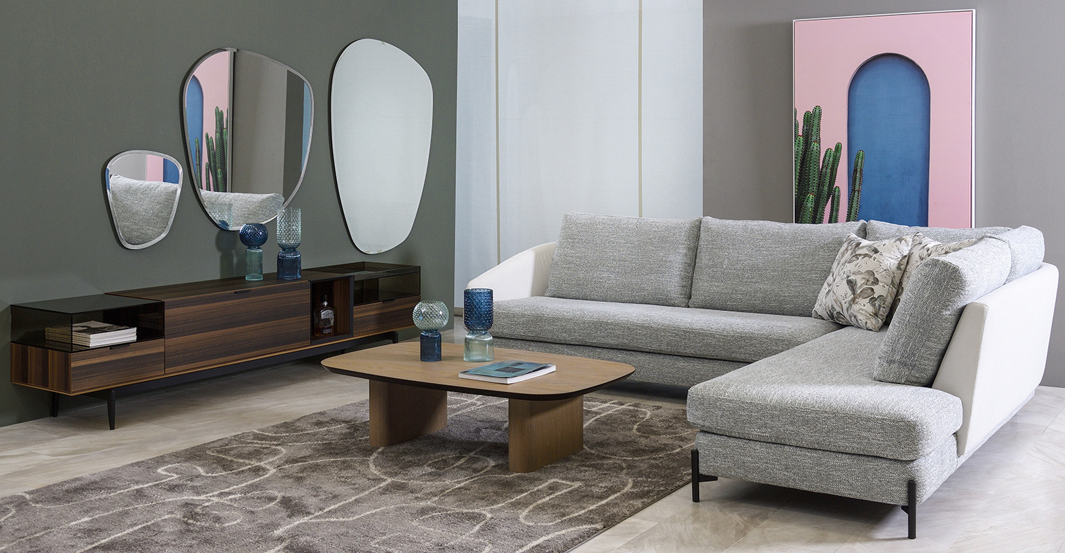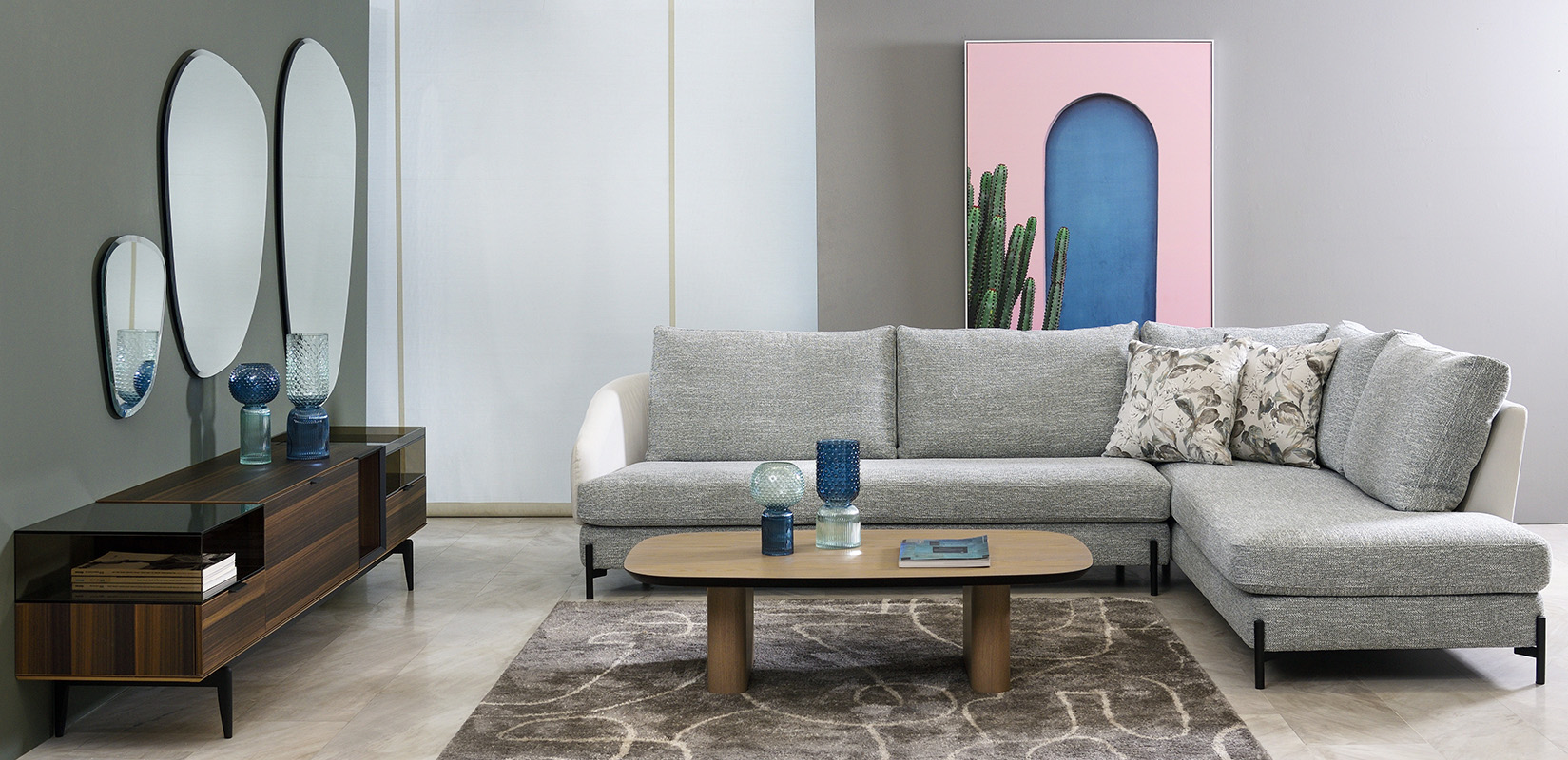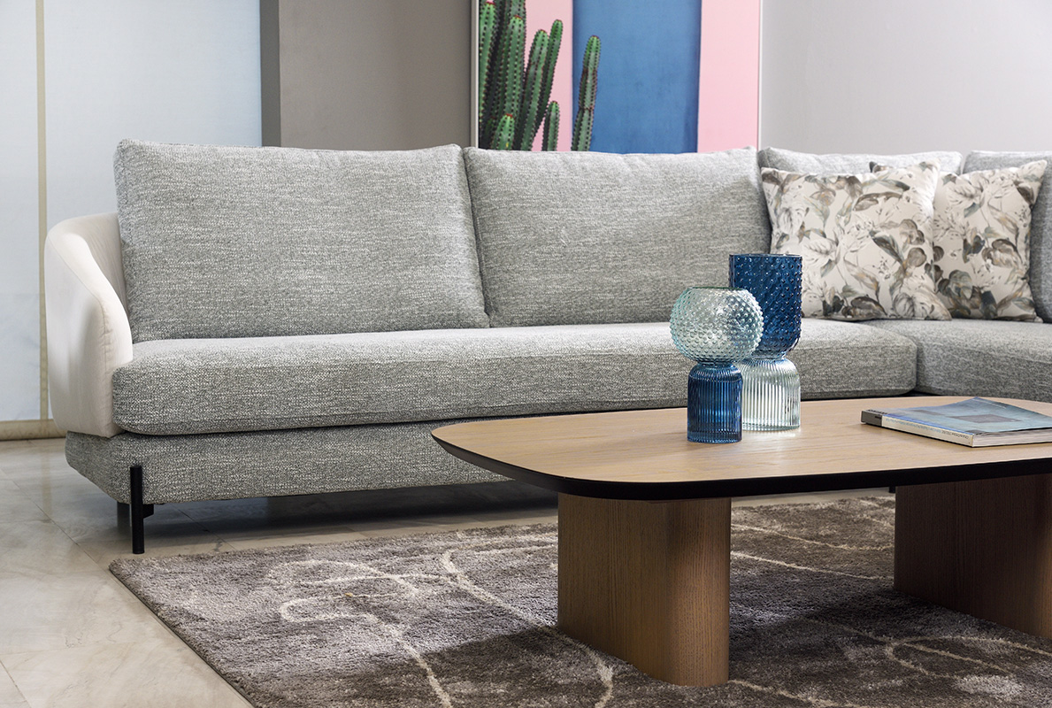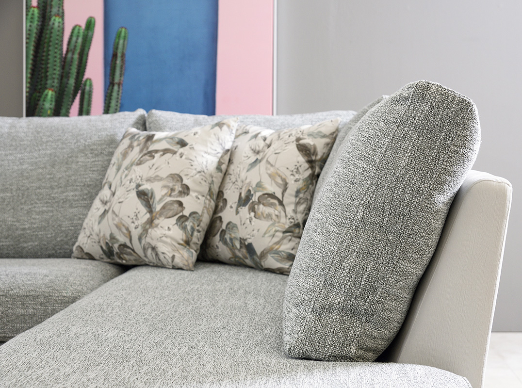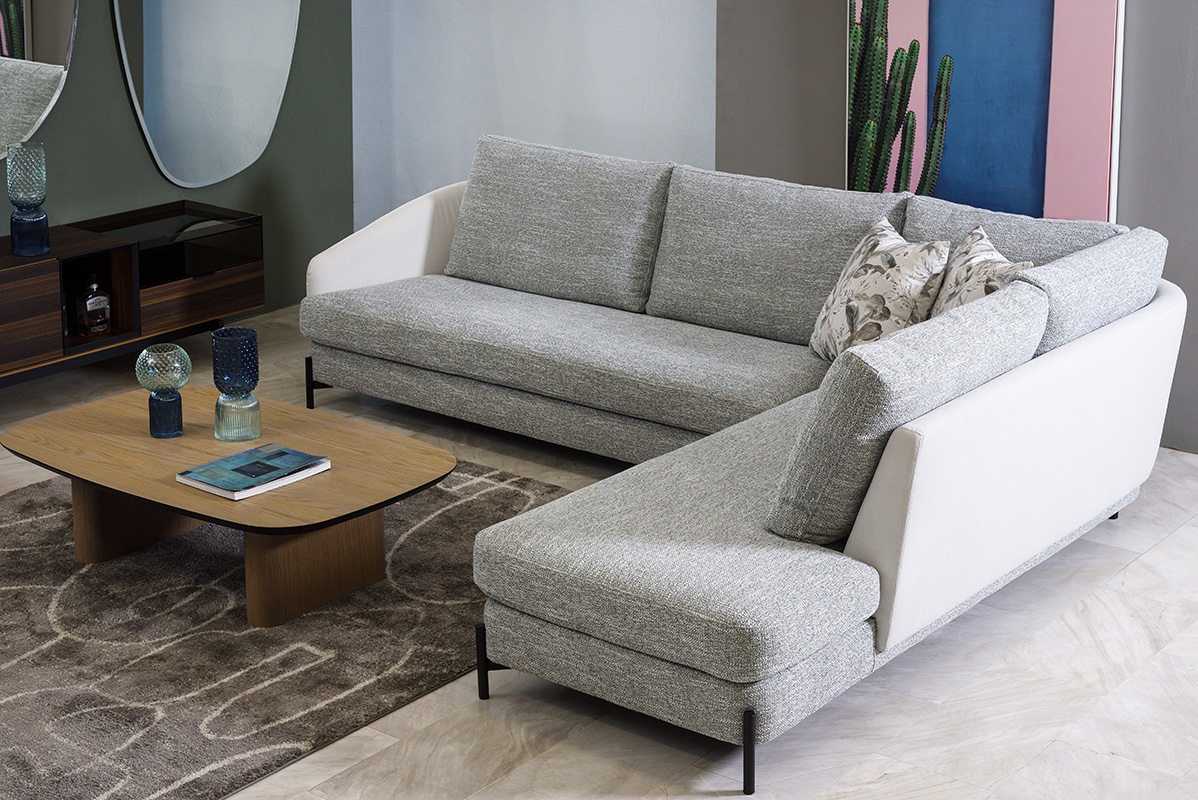 Γωνιακός καναπές με μαύρα μεταλλικά πόδια. Είναι ντυμένος με μπουκλέ ύφασμα συνδυασμένο με μονόχρωμο easy-clean βελούδο στην πλάτη. Ο ιδιαίτερος σχεδιασμός με καμπύλες στην πλάτη τον κάνει ελκυστικό ακόμη και από την πίσω όψη. Το ύφασμα είναι πλενόμενο και μπορεί να αφαιρεθεί από όλα τα μαξιλάρια του καναπέ για ευκολία στο πλύσιμο και τη συντήρηση. Η μαλακή ποιότητα λάστιχου σε συνδυασμό με τα πουπουλένια μαξιλάρια στην πλάτη προσφέρουν απόλυτη αναπαυτικότητα. Παράγεται σε ποικιλία διαστάσεων, αποχρώσεων μετάλλου και υφασμάτων.