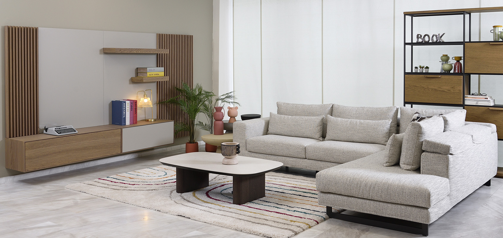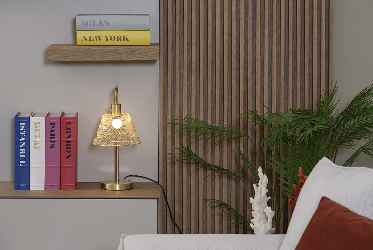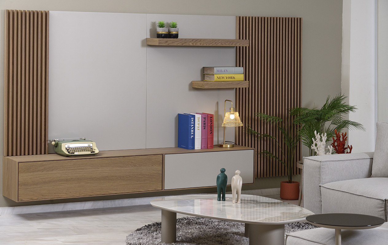 Κρεμαστή σύνθεση σαλονιού με διακοσμητικά ξύλινα πηχάκια. Είναι κατασκευασμένη από ξύλο δρυός και τα πορτάκια λειτουργούν με κρυφούς μηχανισμούς push-pull για αθόρυβη χρήση. Προσαρμόζεται σε κάθε χώρο ξεχωριστά καθώς παράγεται σε ποικιλία διαστάσεων και αποχρώσεων ξύλου.