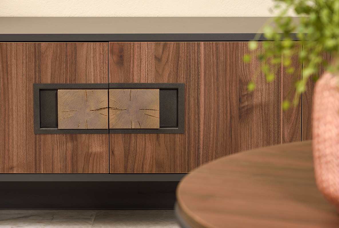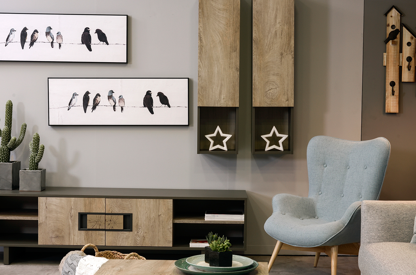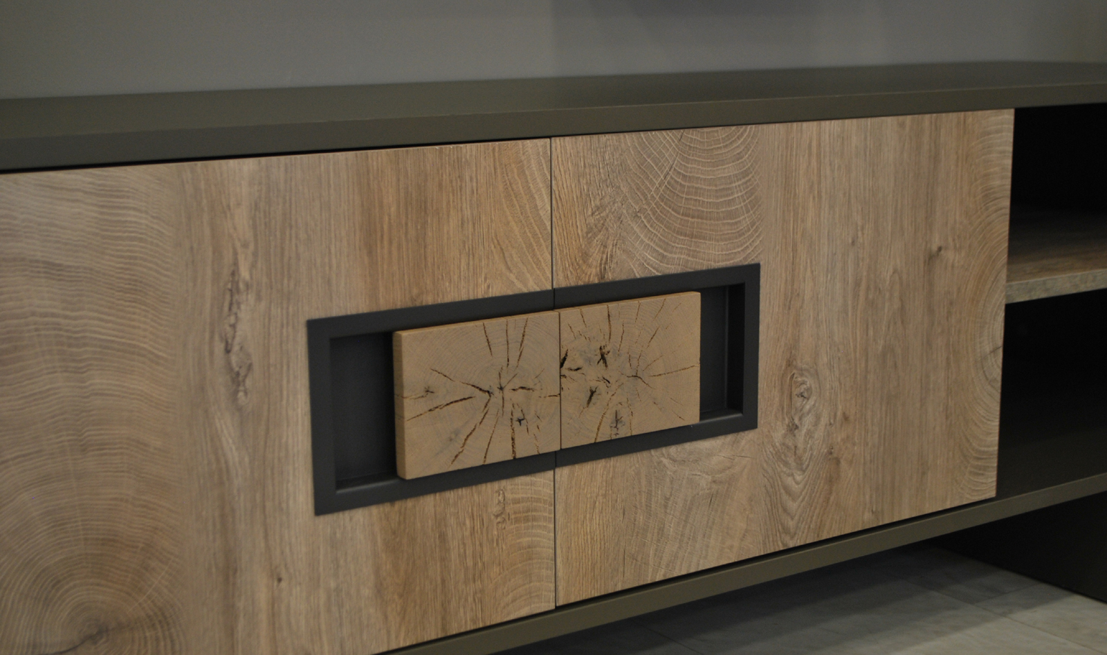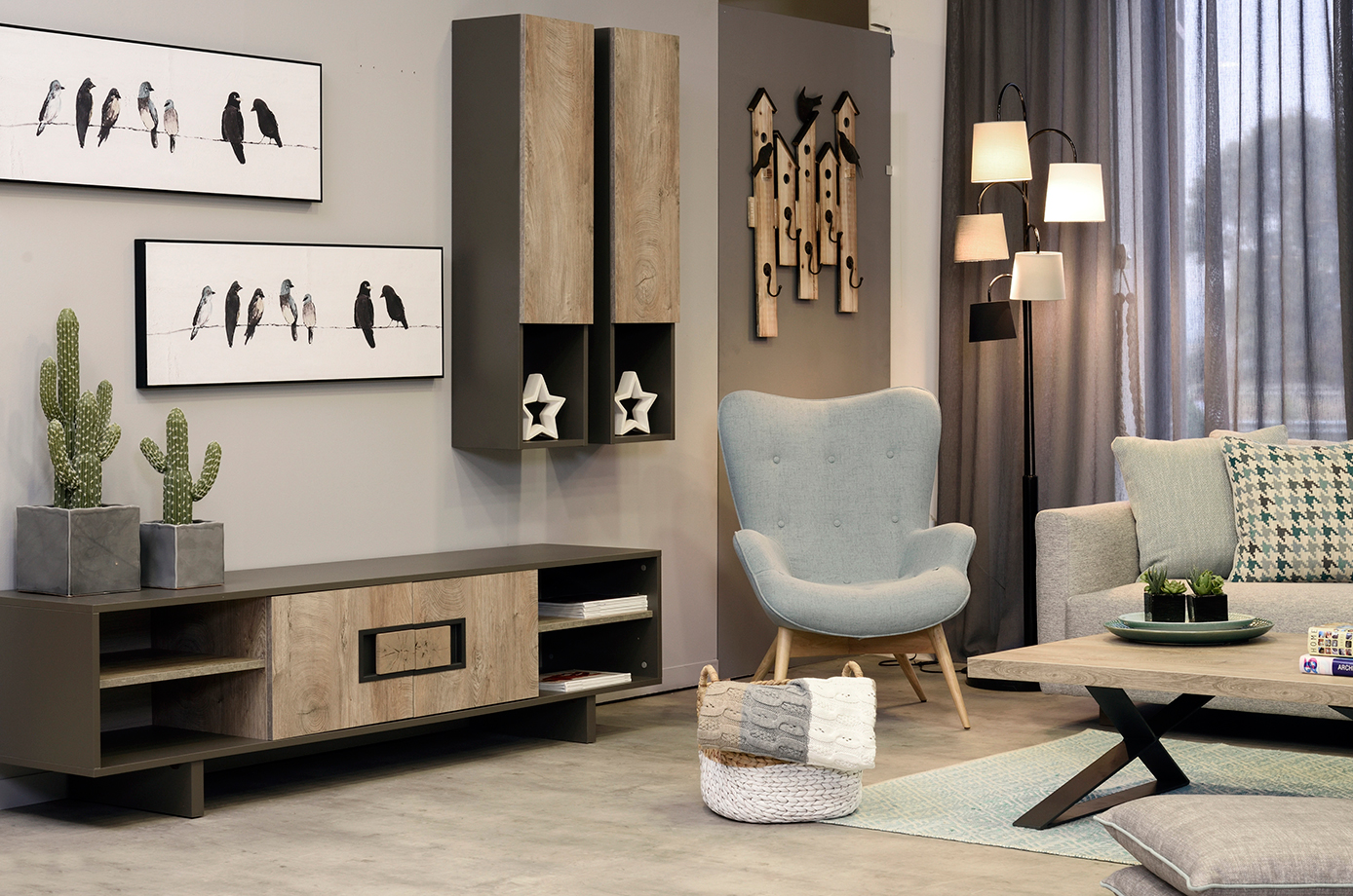 Σύνθεση σαλονιού για τηλεόραση κατασκευασμένη από 3d μελαμίνη, με ένθετα πόμολα από μασίφ ξύλο πεύκου στις πόρτες. Λειτουργεί με μηχανισμούς soft-close για αθόρυβη χρήση.