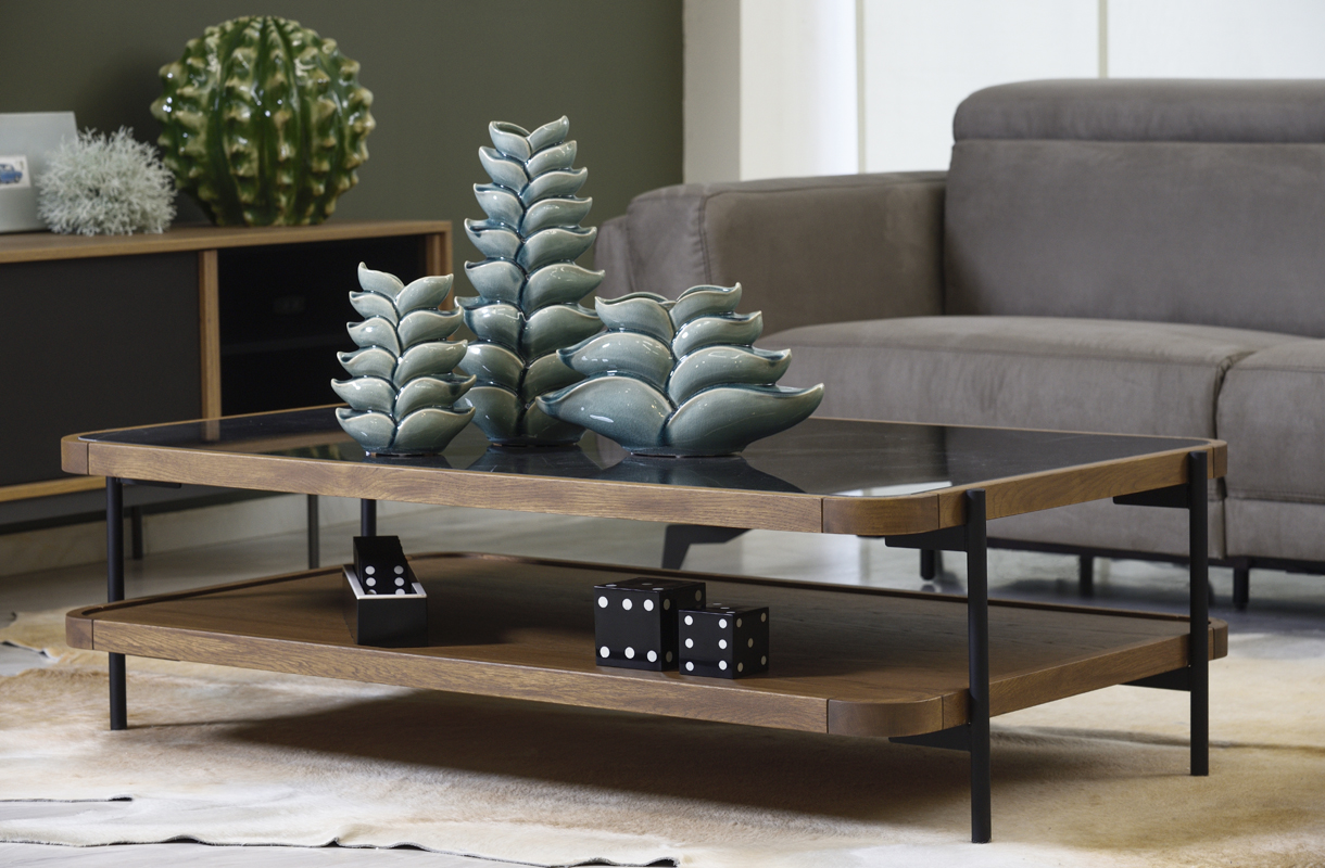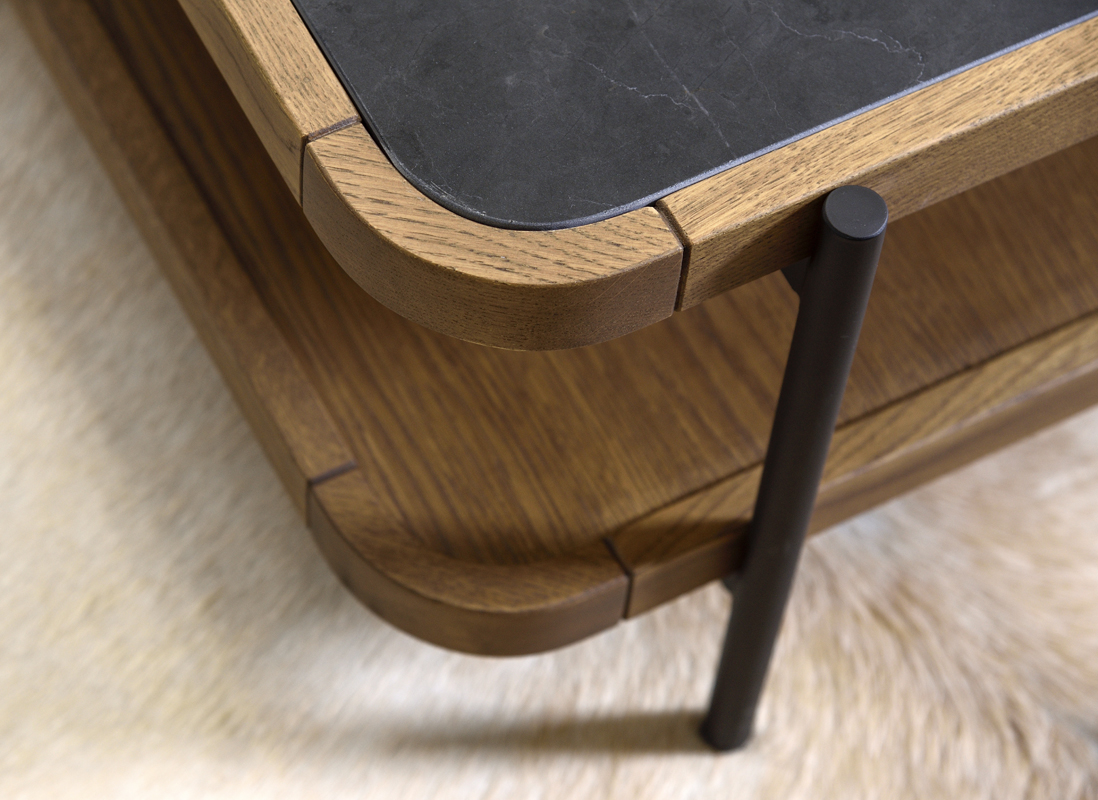 Τραπεζάκι σαλονιού δυο επιπέδων με μαύρα μεταλλικά πόδια. Είναι κατασκευασμένο από μασίφ ξύλο δρυός, ενώ στις επιφάνειές του εναλλάσσονται το κεραμικό υλικό με το ξύλο. Παράγεται σε ποικιλία διαστάσεων, αποχρώσεων ξύλου, μετάλλου αλλά και κεραμικού υλικού.