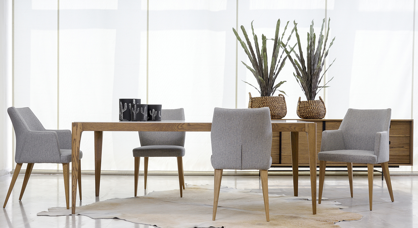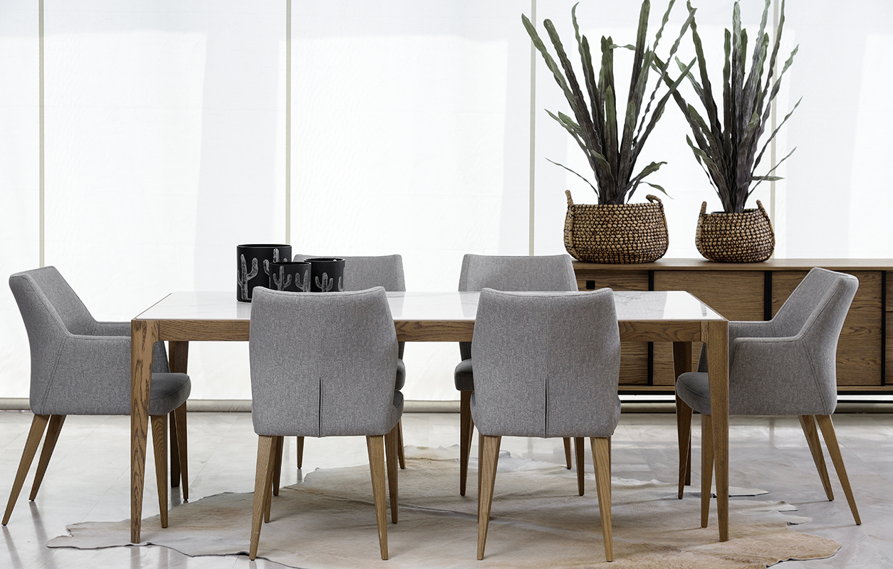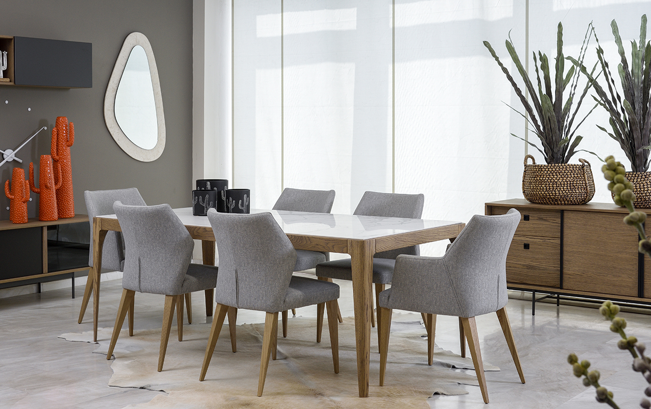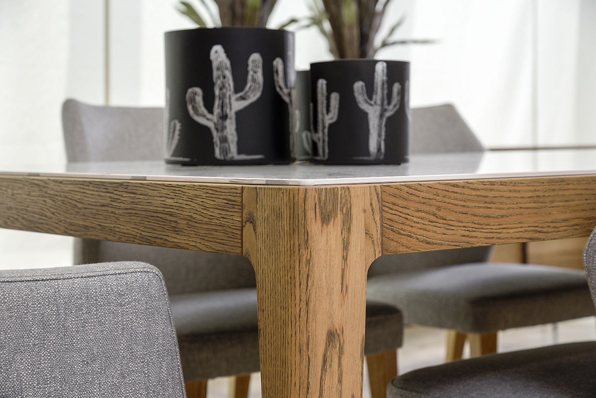Chic τραπεζαρία από μασίφ ξύλο δρυός και λευκή κεραμική επιφάνεια. Επιλέξτε ανάμεσα σε αμέτρητες αποχρώσεις δρυός και 9 διαφορετικές κεραμικές επιφάνειες ώστε να συνθέσετε το δικό σας μοναδικό αποτέλεσμα. Η επιφάνεια μπορεί να παραμείνει δρύινη για τους λάτρεις του ξύλου. Προσαρμόστε την τραπεζαρία στις διαστάσεις του χώρου σας ή επιλέξτε μια από τις διαθέσιμες διαστάσεις 1.60x0.90, 1.80x1.00, 2.00x1.00, 2.20x1.00. Συνδυάστε τη με τον μπουφέ Berlin για ολοκληρωμένο αισθητικό αποτέλεσμα.