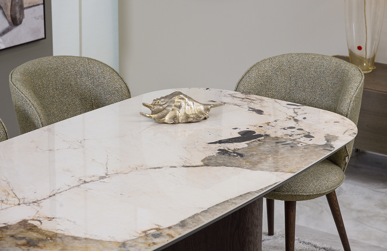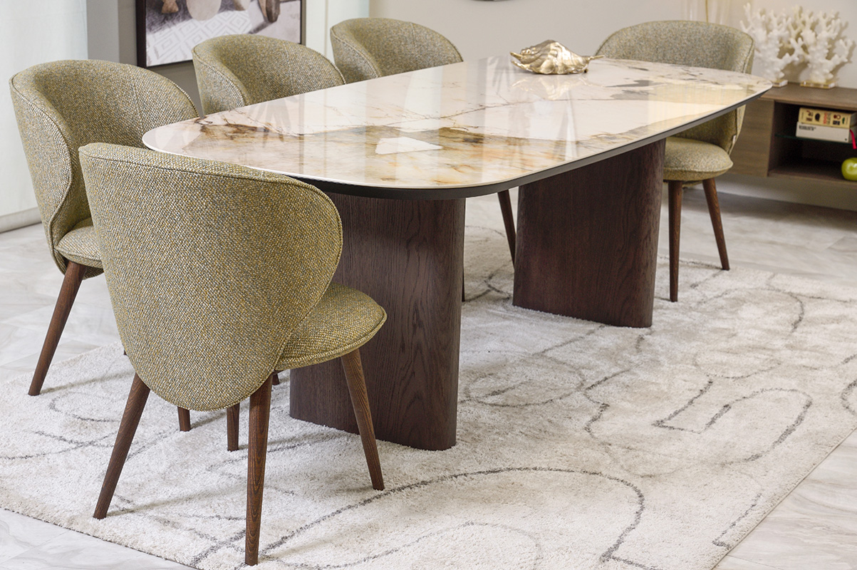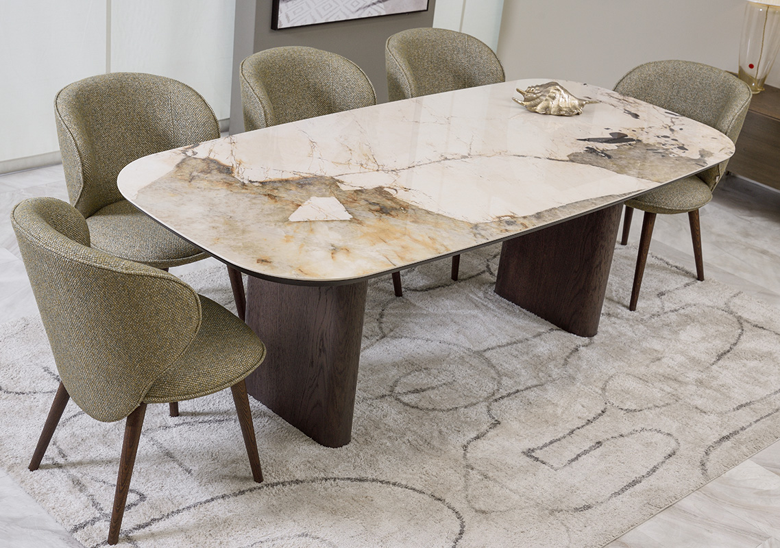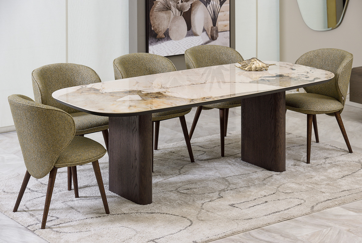 Τραπεζαρία κατασκευασμένη από ξύλο δρυός και κεραμική επιφάνεια. Το μαλακό της καμπυλωτό σχήμα την κάνει πιο φιλική για όσους κάθονται γύρω της. Η επιφάνεια μπορεί να παραμείνει δρύινη για τους λάτρεις του ξύλου. Επιλέξτε ανάμεσα σε αμέτρητες αποχρώσεις δρυός και 18 διαφορετικές κεραμικές επιφάνειες ώστε να συνθέσετε το δικό σας μοναδικό αποτέλεσμα.  Διαθέσιμες διαστάσεις 1.60×0.90, 1.80×1.00, 2.00×1.00 και 2.20×1.00.