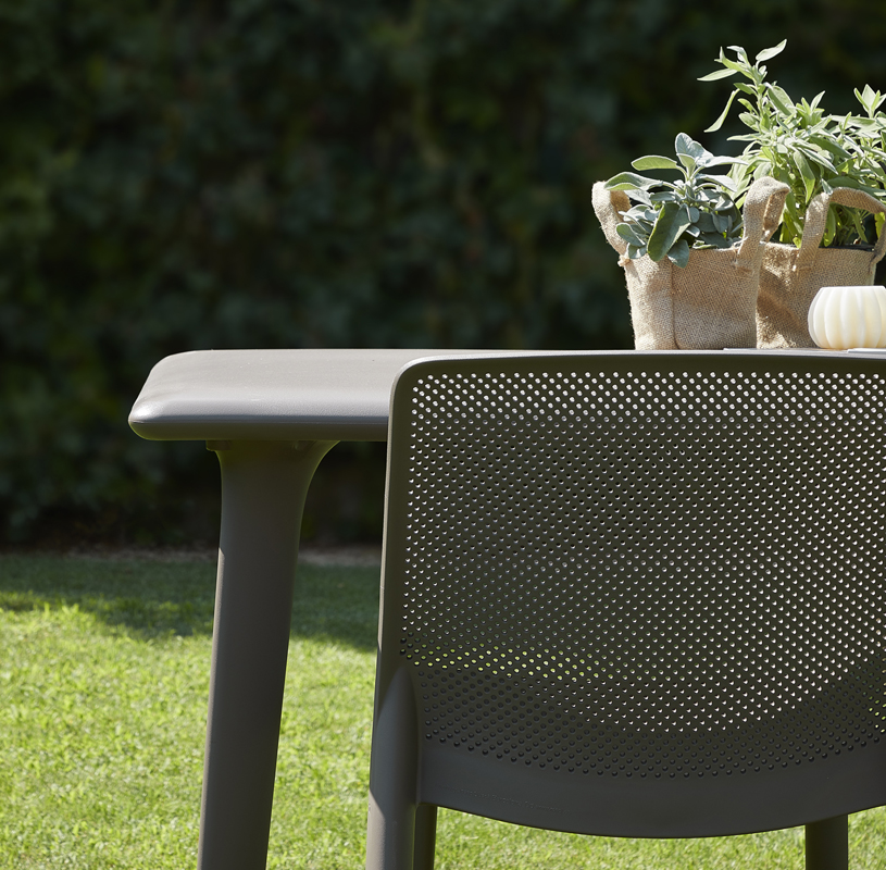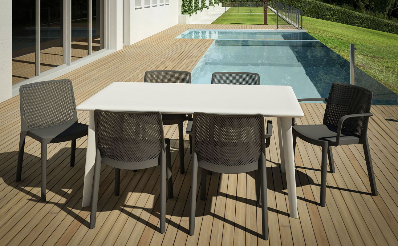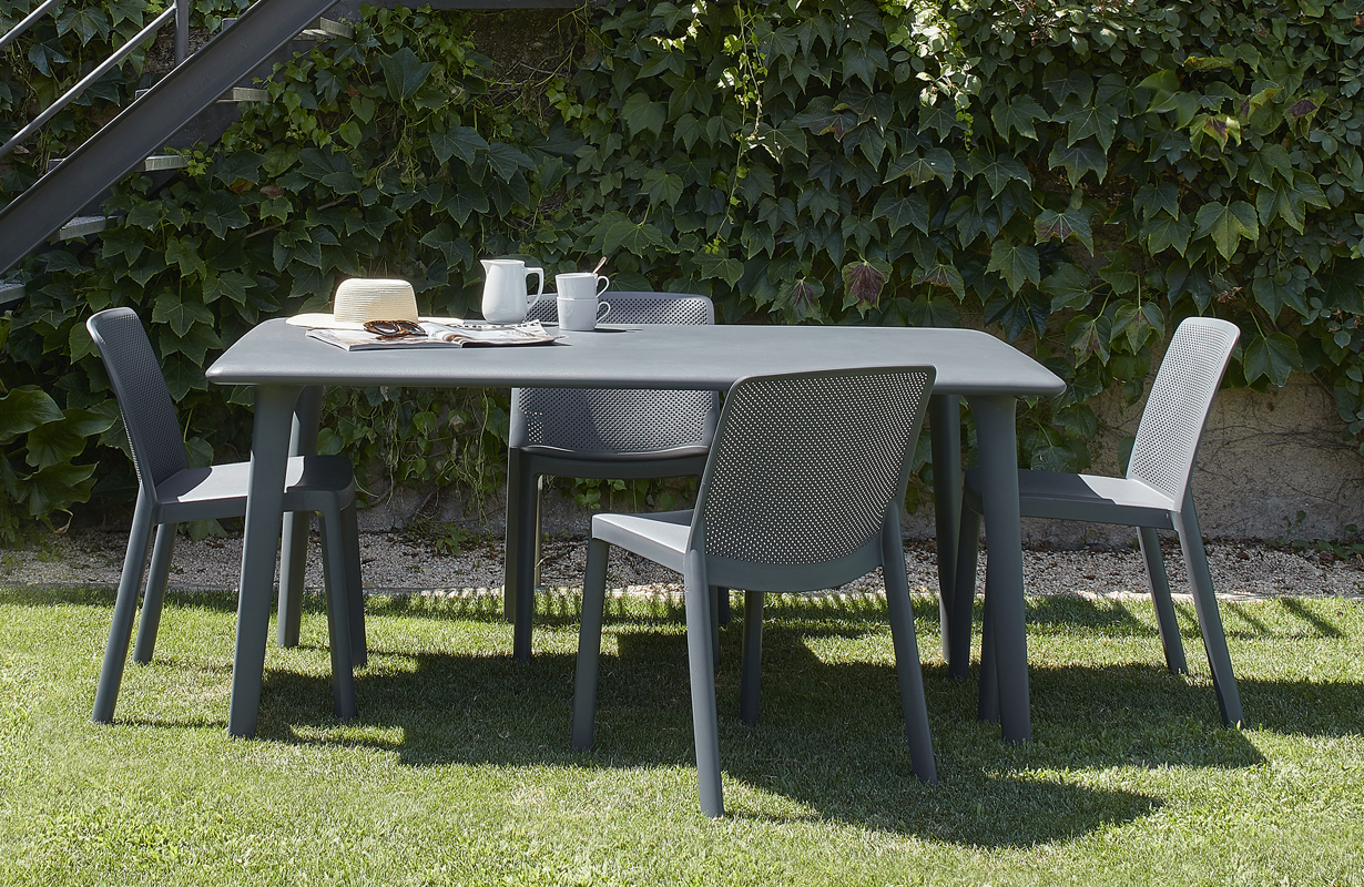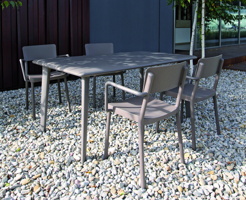 Τραπέζι εξωτερικού χώρου από πολυπροπυλένιο. Το καπάκι του είναι σχεδιασμένο με καμπύλες ώστε να καθαρίζεται εύκολα από σκόνες και νερά. Παράγεται σε 4 αποχρώσεις.